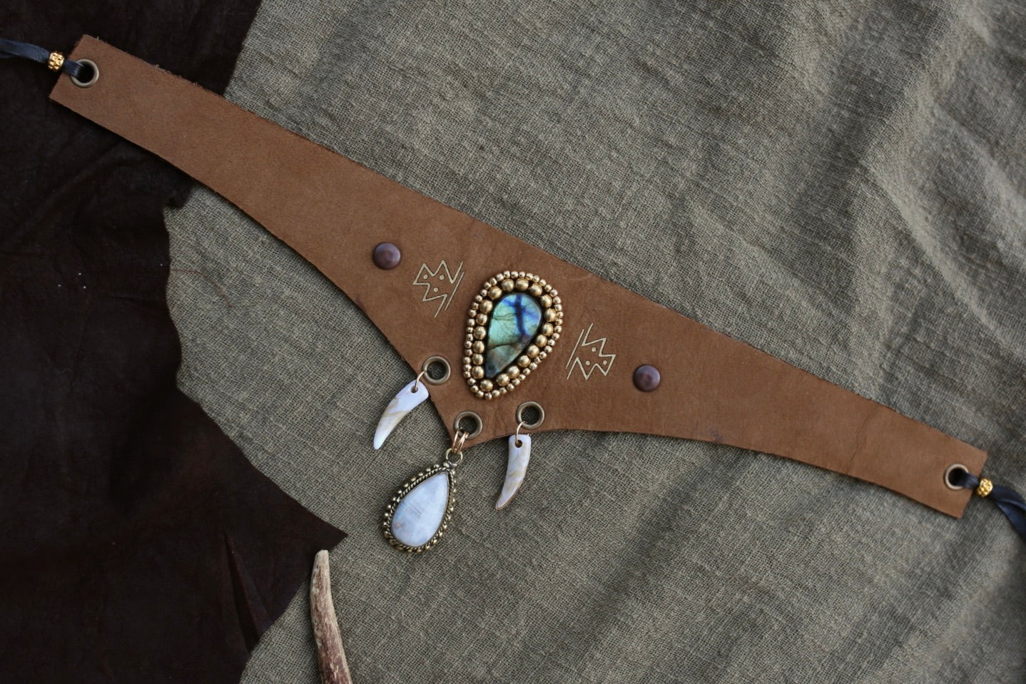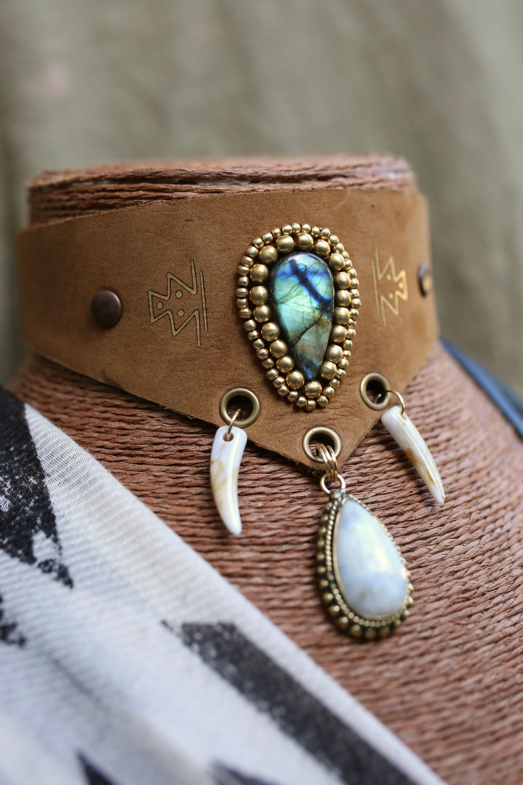 Collier en cuir (Nubuck) marron clair, inspiré par l’horizon ouvert et les lumières changeantes du désert.