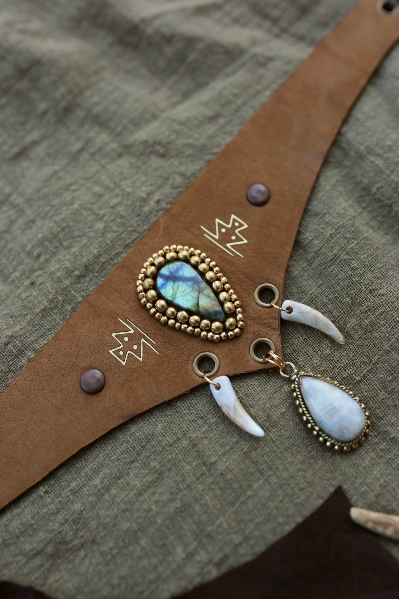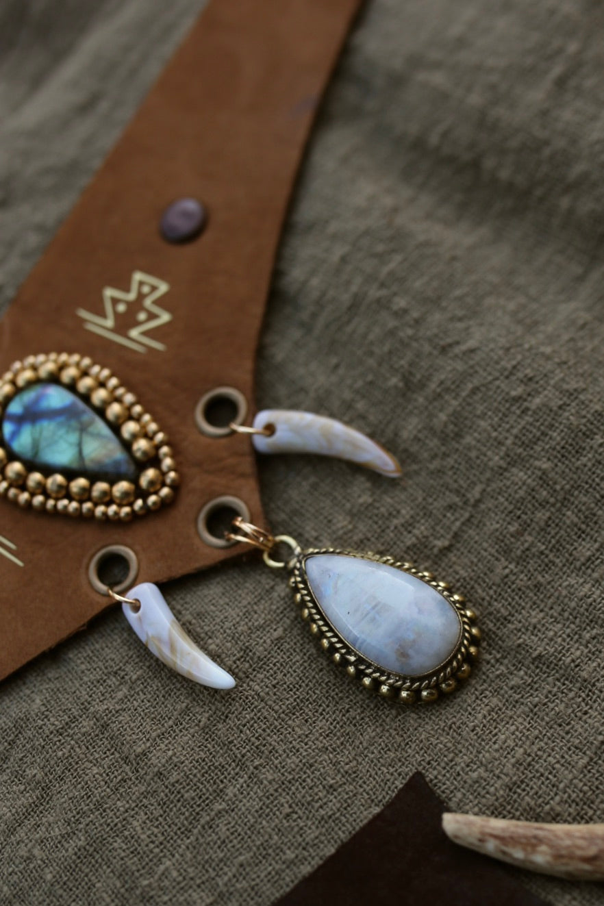 La labradorite centrale révèle de subtils reflets bleutés, entourée de détails dorés et de pendentifs délicats qui apportent équilibre et mouvement à la pièce.