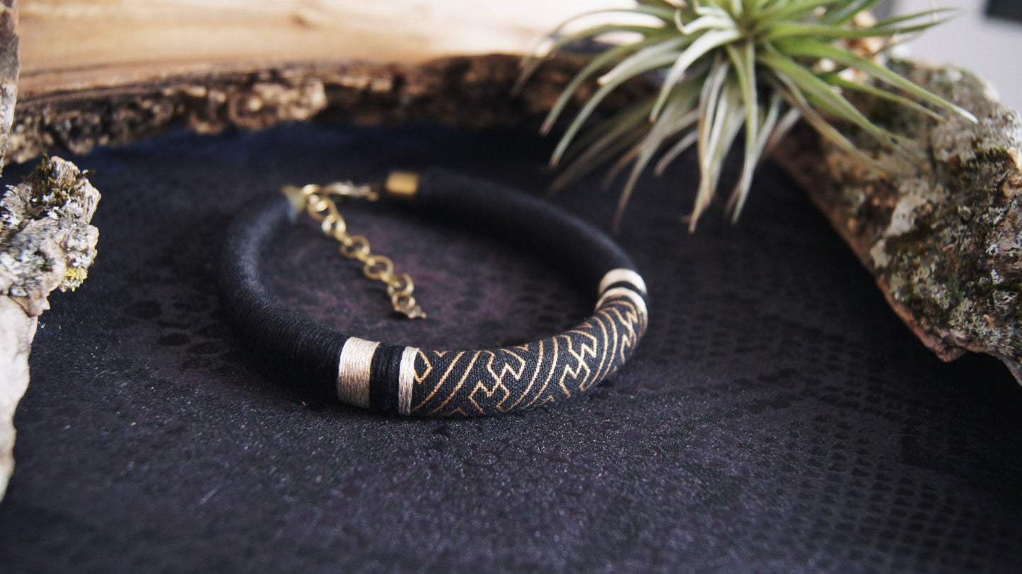 J'ai utilisé pour la première fois du tissu 100% coton avec un motif unique svastika. Ainsi que du fil en coton noir et doré.