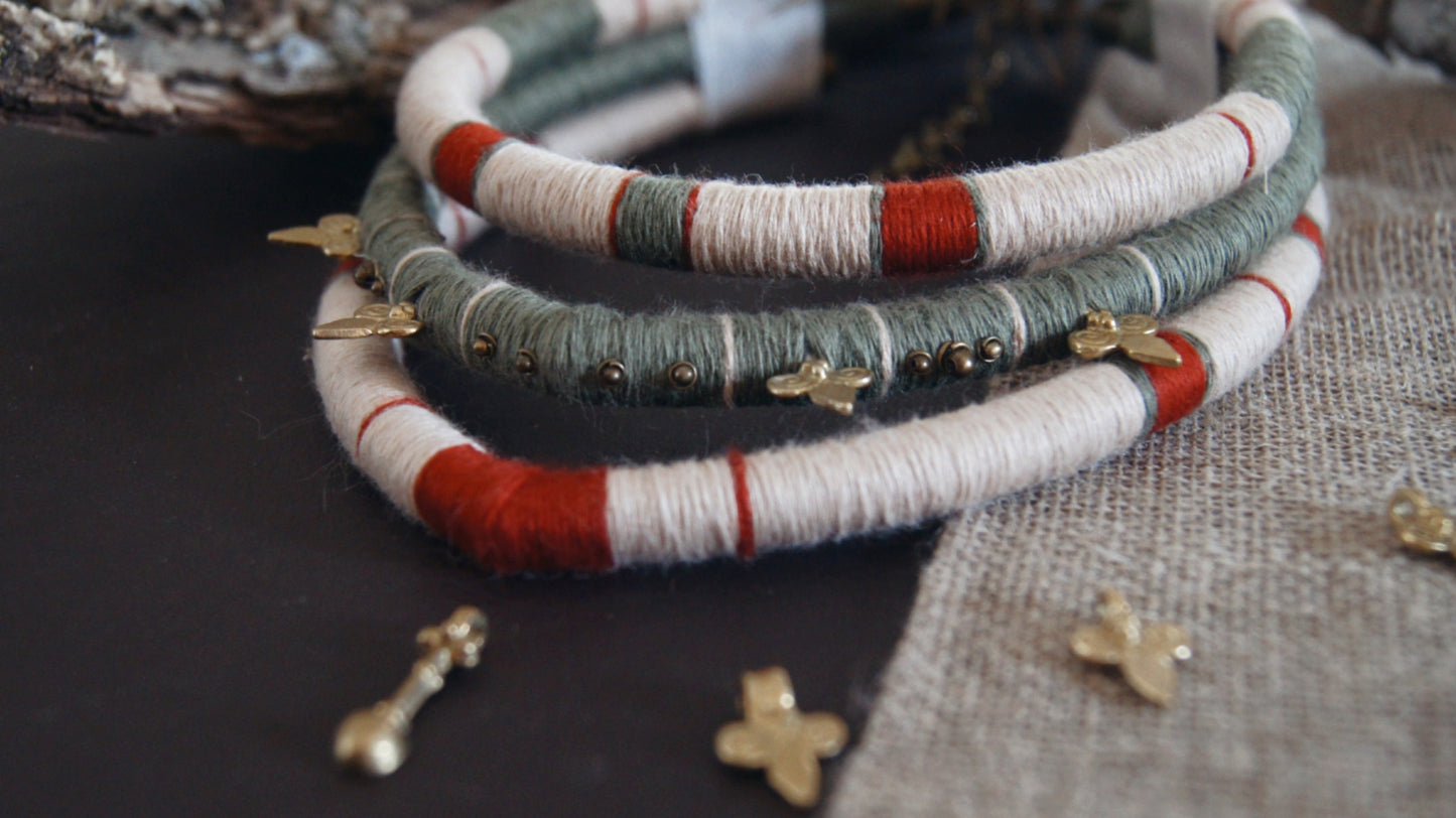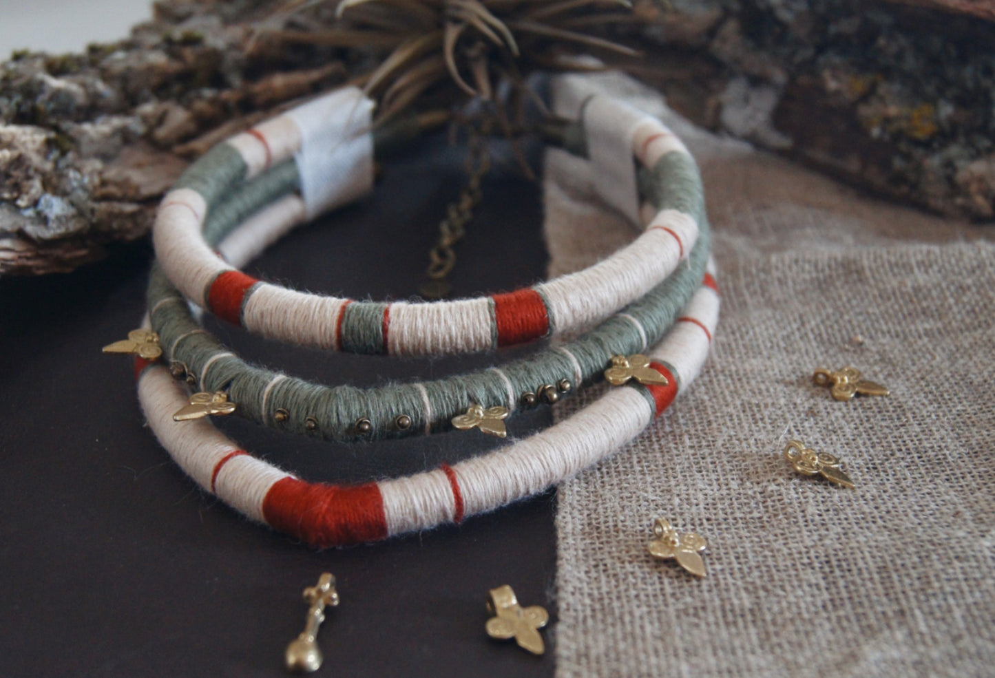 J'ai confectionné ce collier avec du fil 100% coton de couleurs marron, kaki et beige.