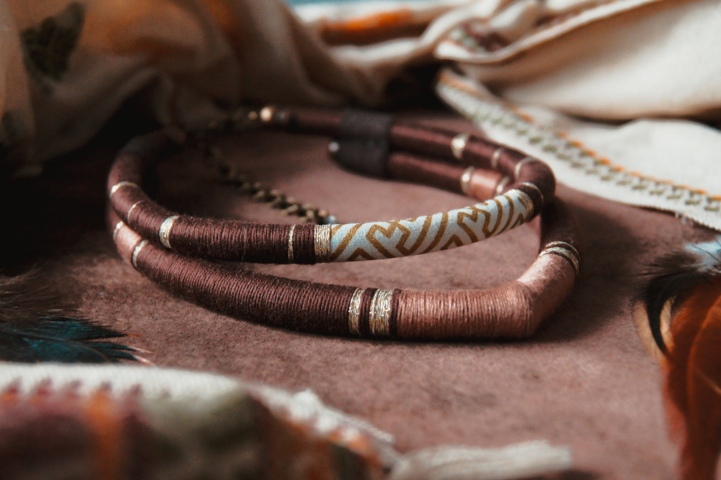 J'ai confectionné ce collier avec du fil 100% coton de couleurs marron, beige & doré.
