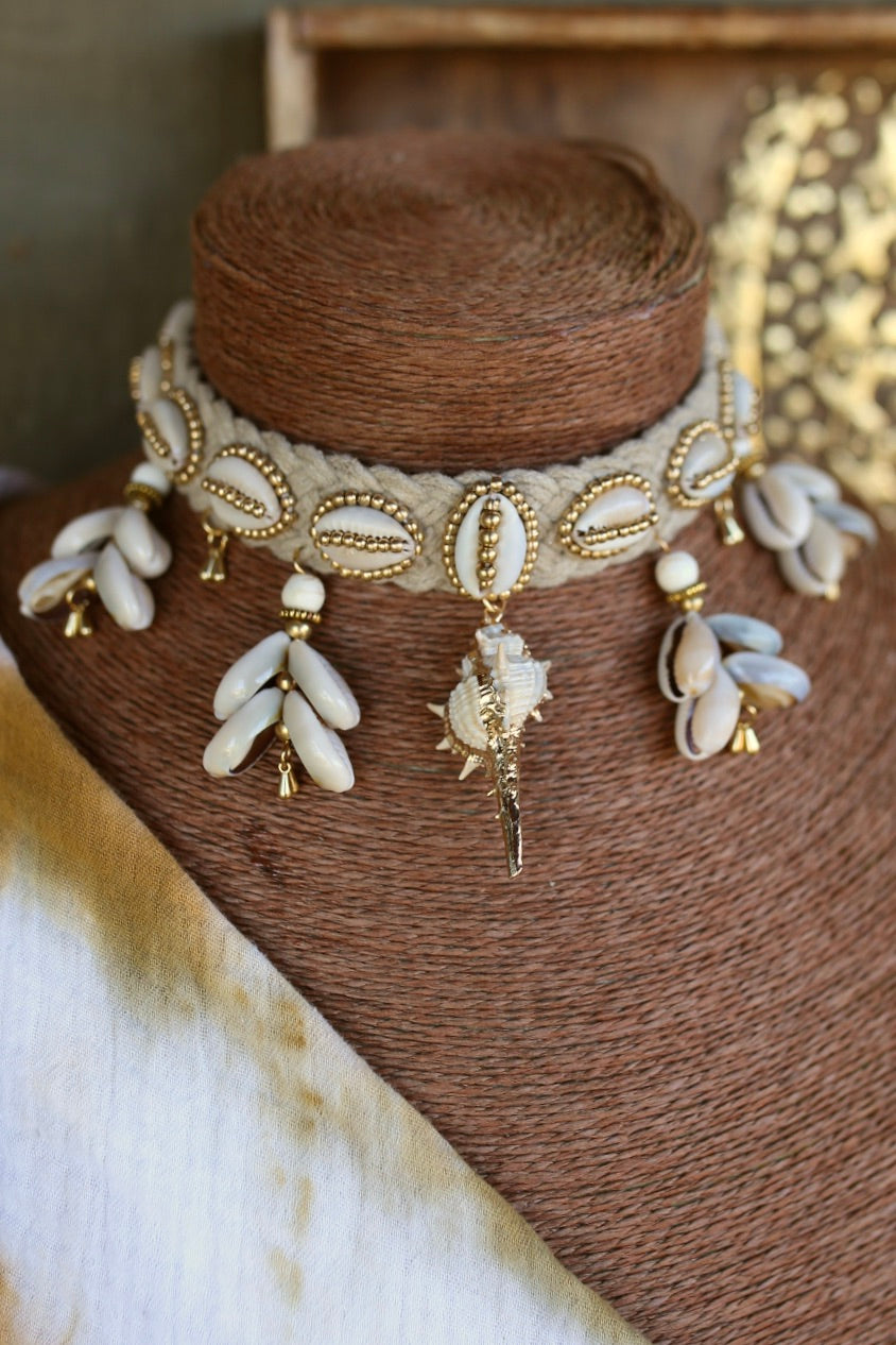 Entièrement tissé à la main avec du fil naturel, il est orné de coquillages cowrie brodés de perles dorées et de pampilles marines, dont un coquillage central doré comme sculpté par les vagues.