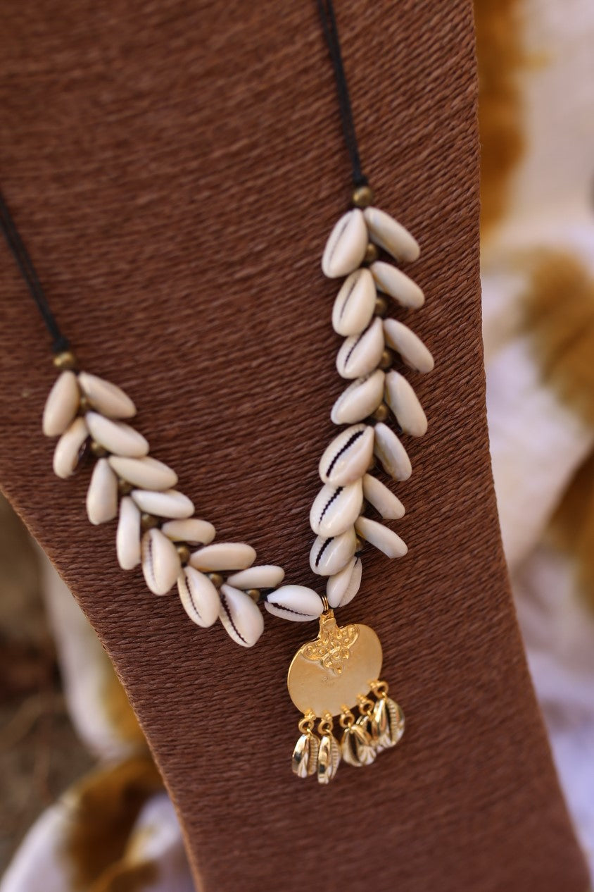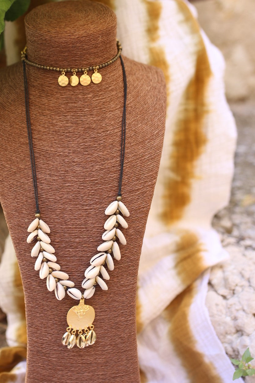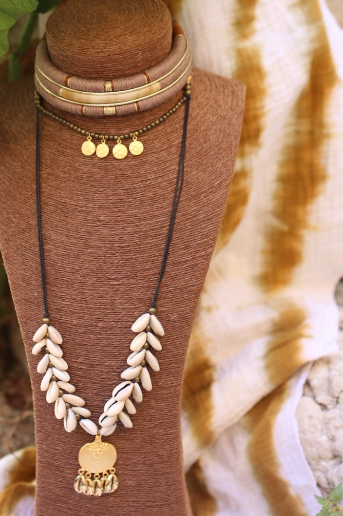 Collier ras de cou a trois rangs ornée d'un collier de perle bronze et doré. J'ai aussi ajoutée de magnifique coquillages cauris.