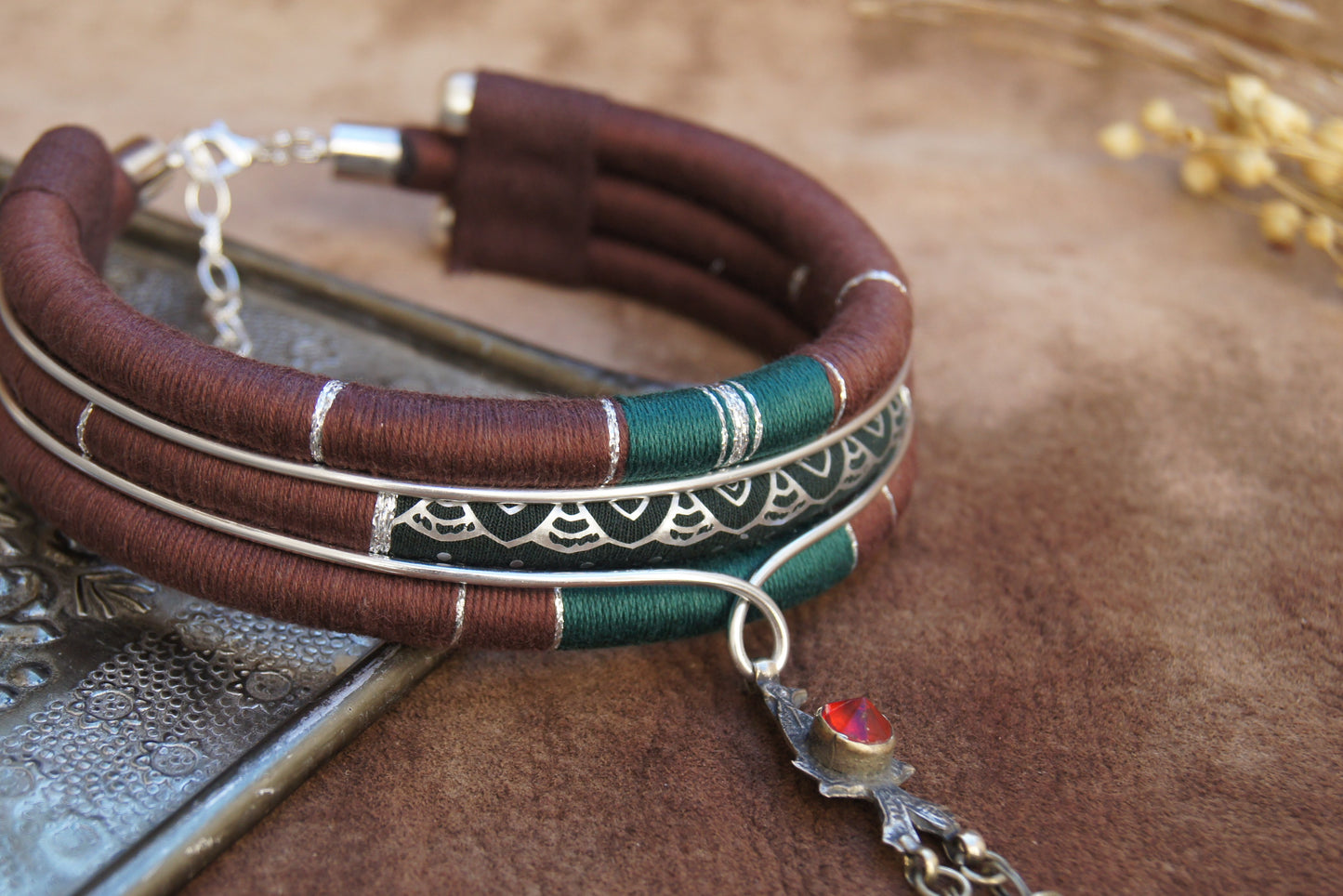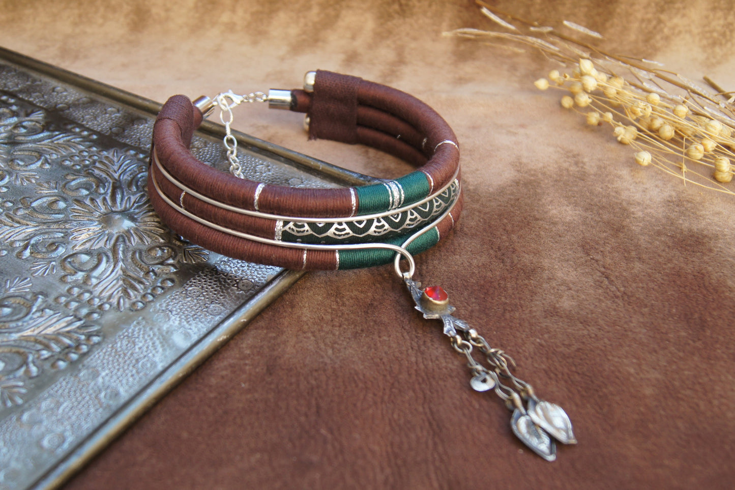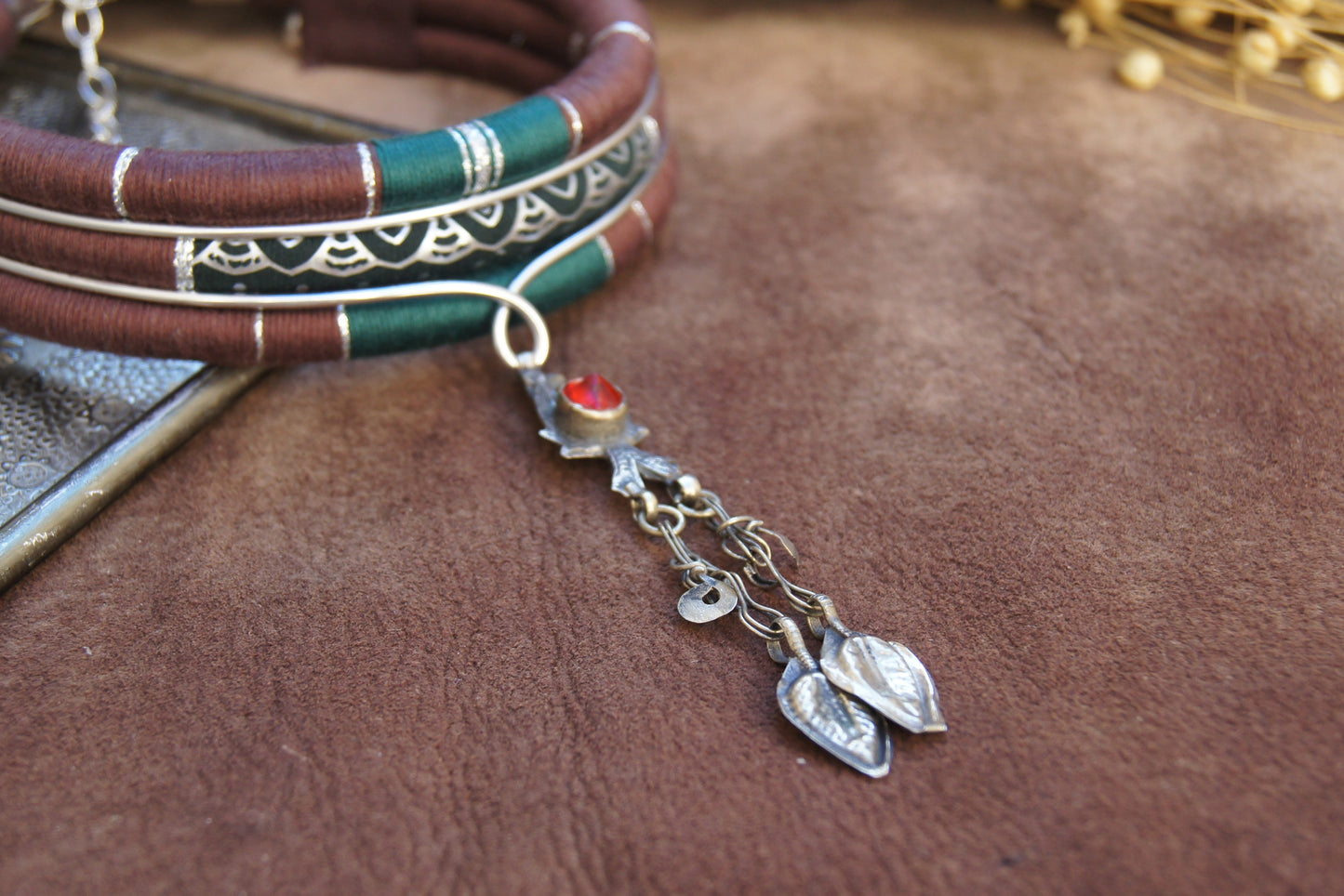 J'ai crée cette collection de bijoux avec de véritable pendentifs kuchi en argent ainsi que avec des tissu que j'ai moi même crée grâce aux sublimes ornements dessiné par Eva. Ils sont tous unique et fabriquer a la main.