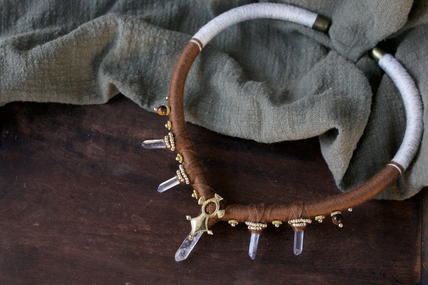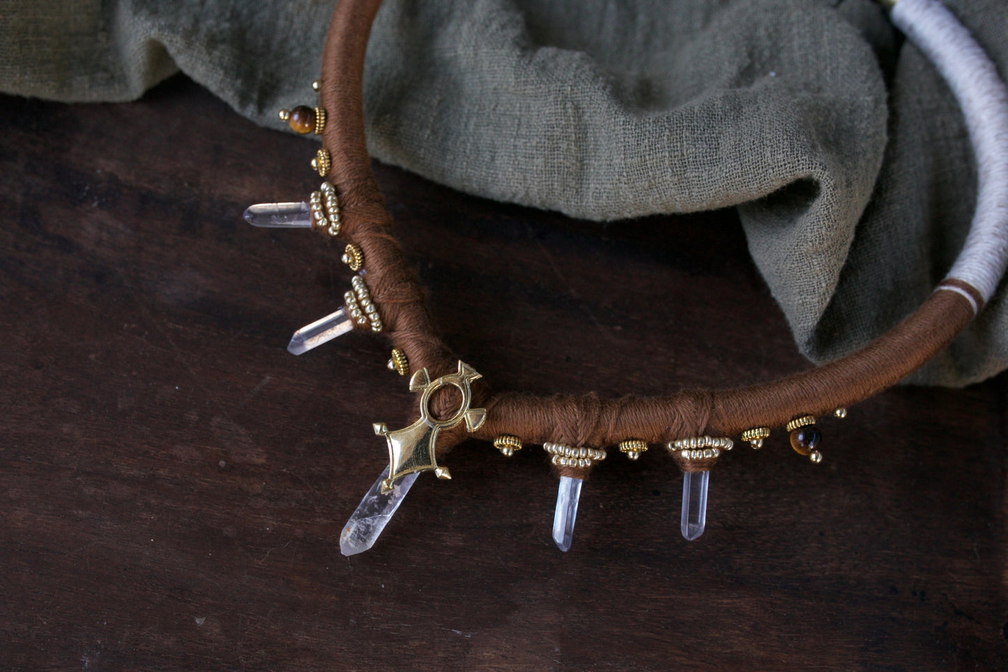 J'ai inclus une magnifique pierre en cristal de roche. Ainsi que quelques perles en laiton ou bronze.