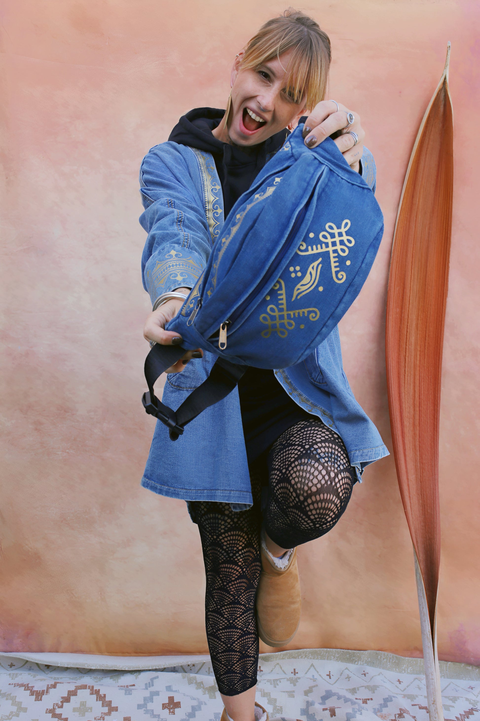 Sac banane en jean, transformé et orné à la main de motifs dorés et noirs inspirés de symboles ethniques.