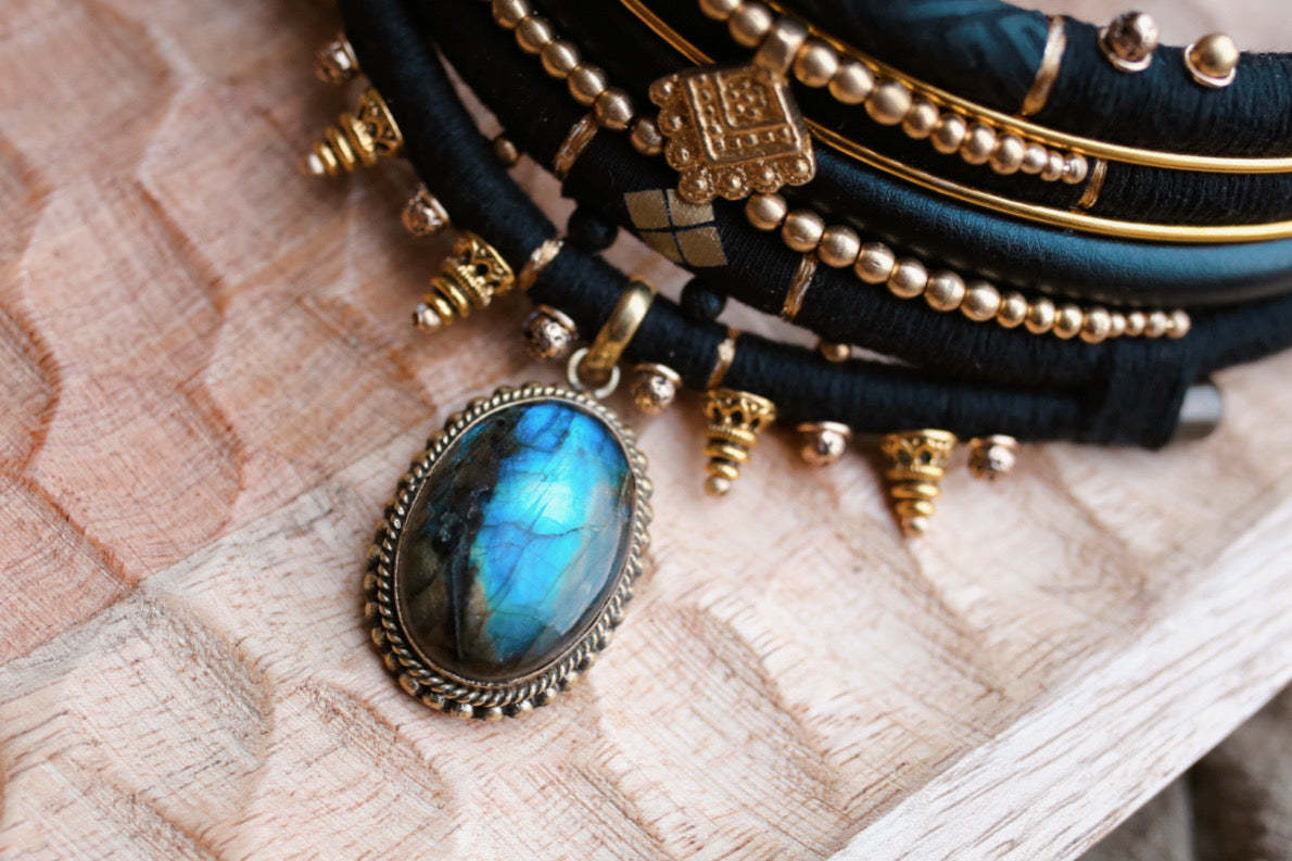 une labradorite ovale aux reflets bleutés, montée en pendentif.