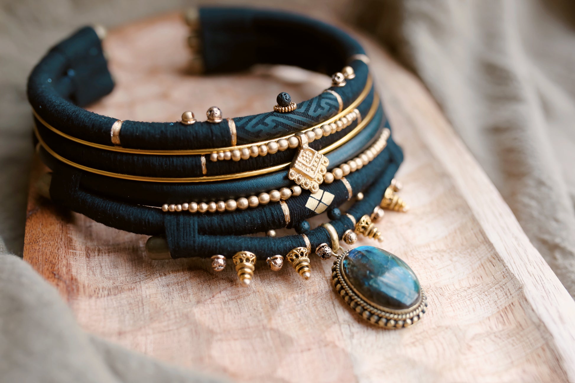 Collier à 5 rangs, entièrement réalisé à la main avec :