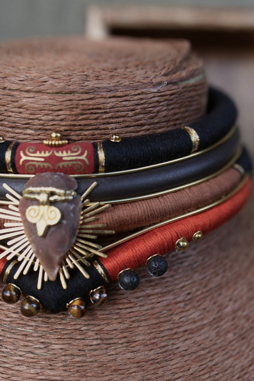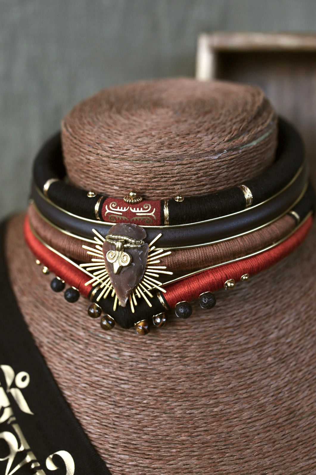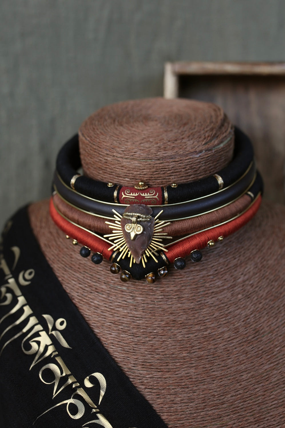 Collier multi-rangs entièrement amovible, composé de 4 rangs en fil de coton noir, brun et terre cuite, agrémenté de laiton travaillé et de perles en acier inoxydable.