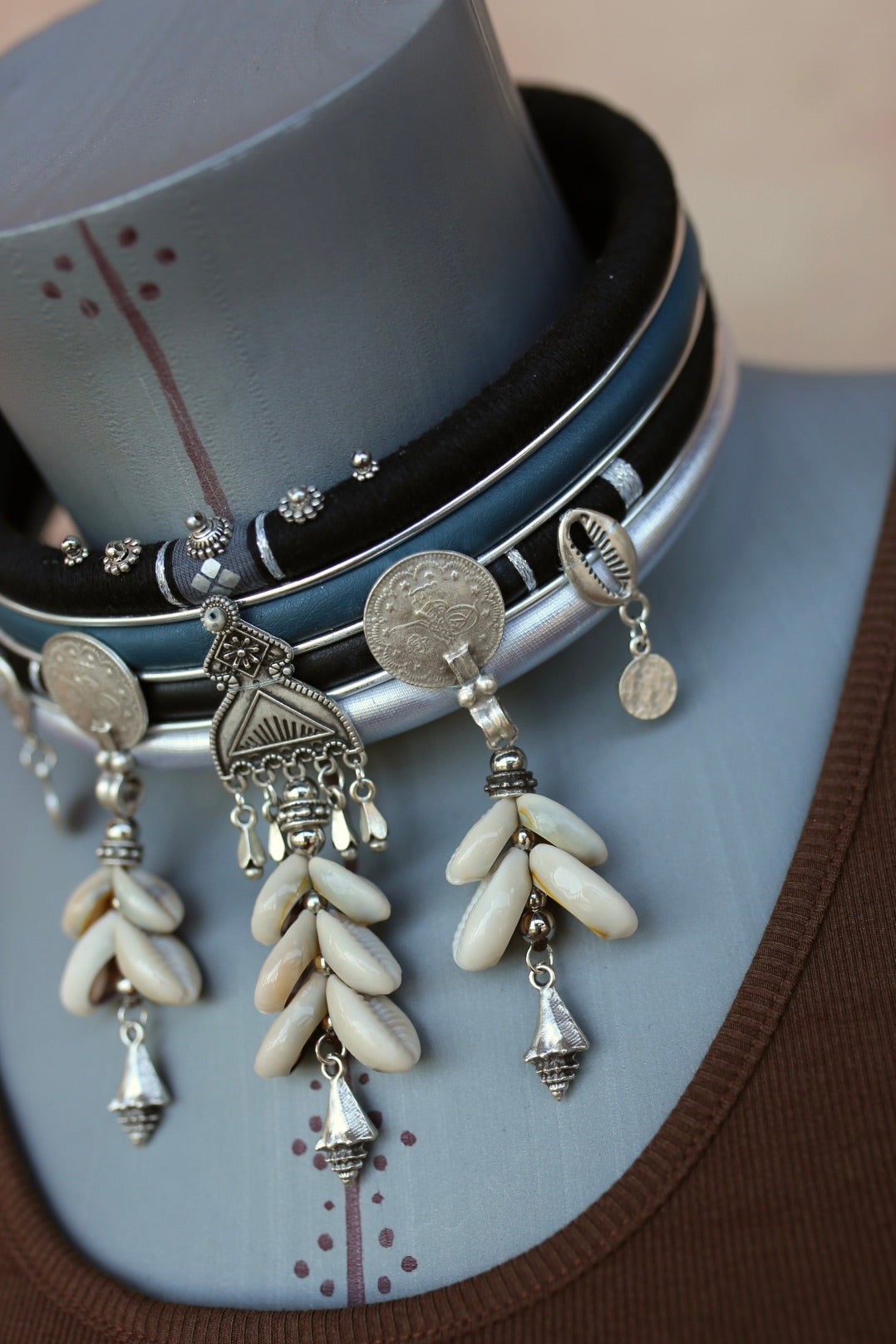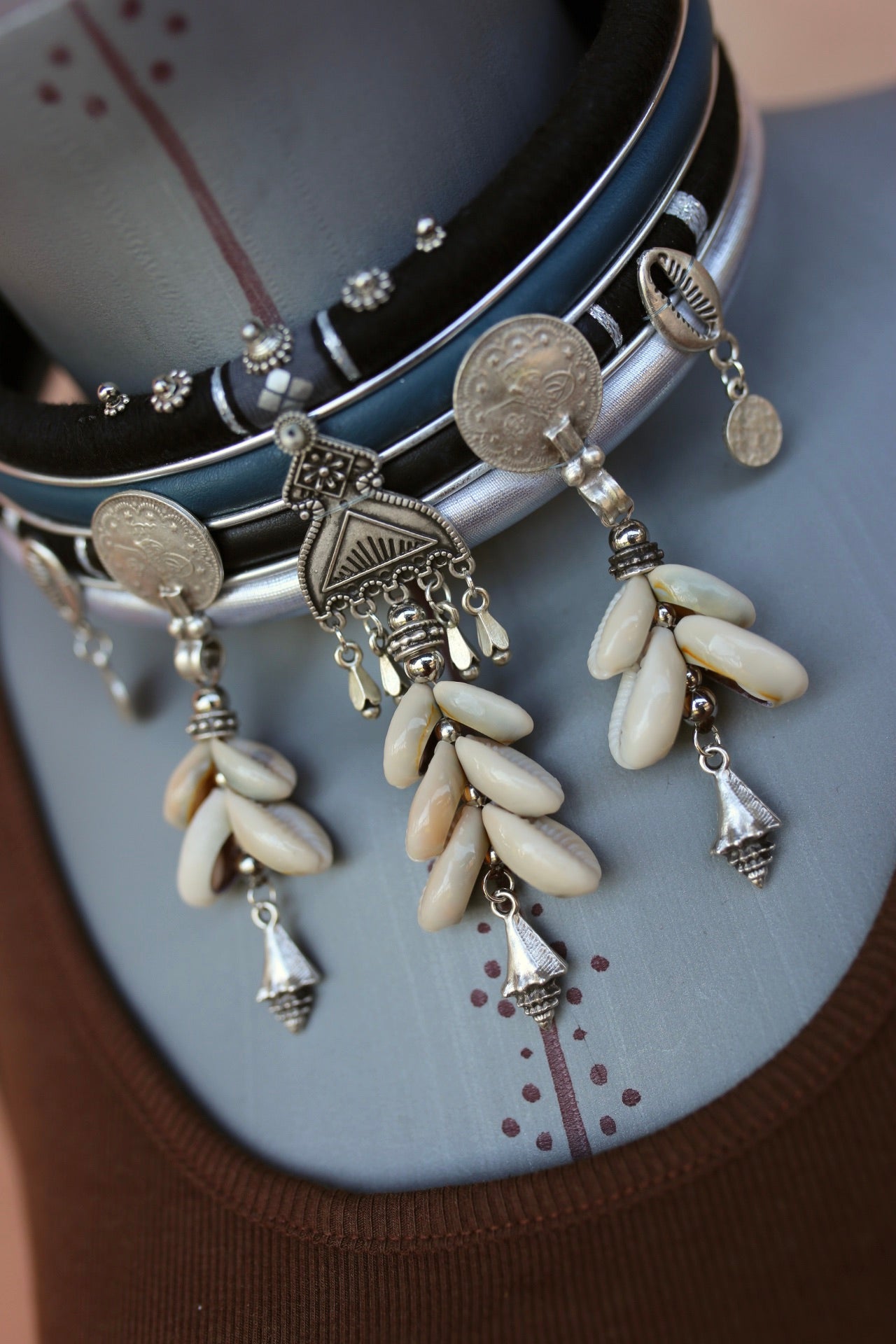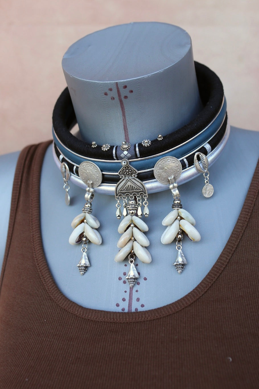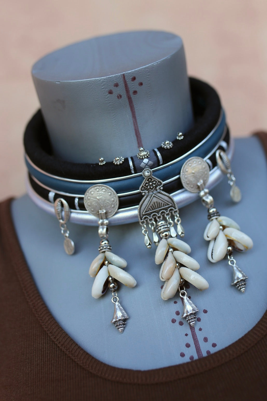 Collier à quatre rangs totalement amovible, mariant cordons textiles, coquillages naturels et pendentifs argentés ciselés. Orné de pièces anciennes et de pampilles en forme de coquilles, il incarne l’esprit marin et tribal.