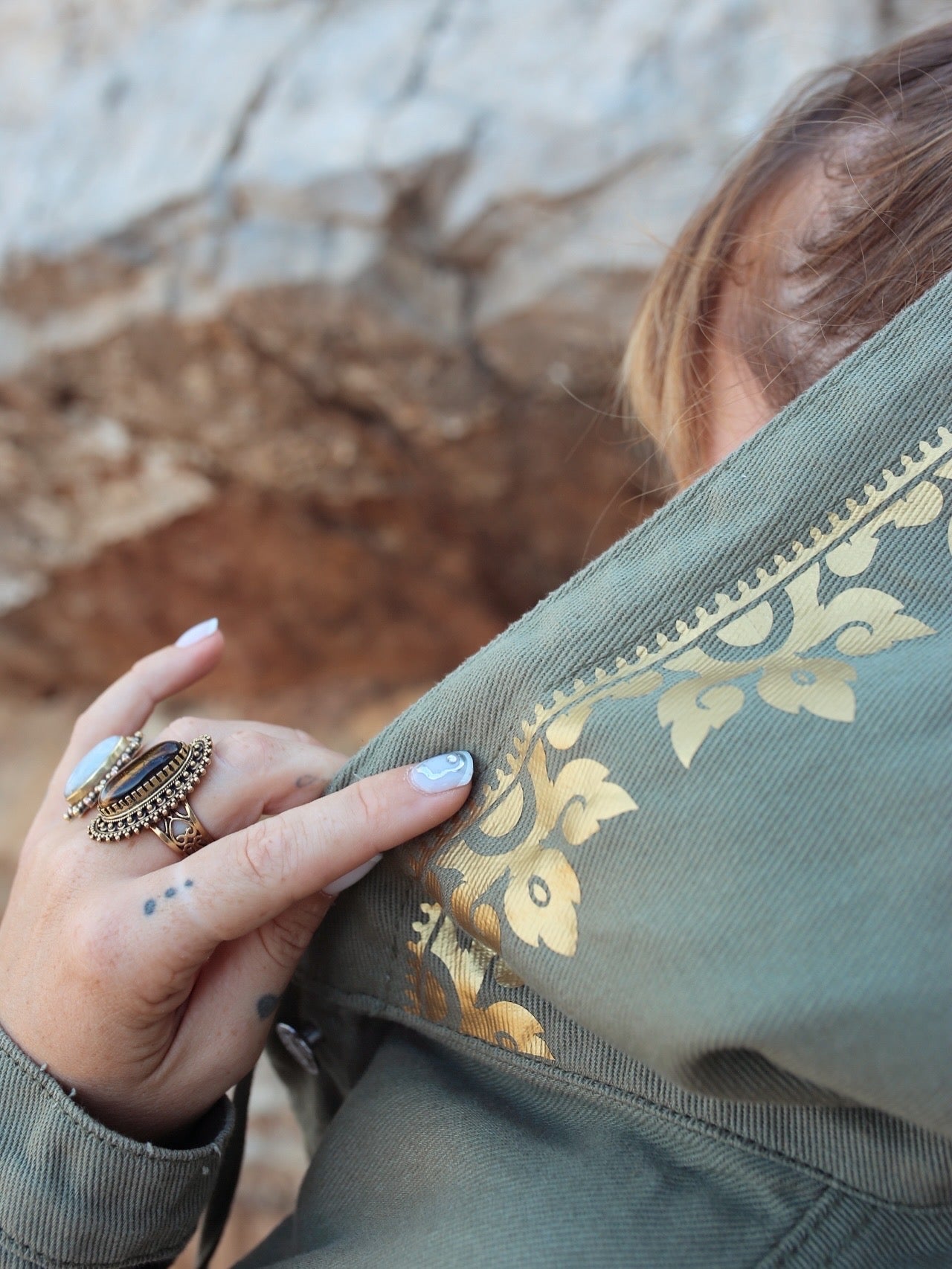 Cette veste en jean kaki, dotée d’une capuche pratique, se distingue par un imposant motif tribal doré au dos.