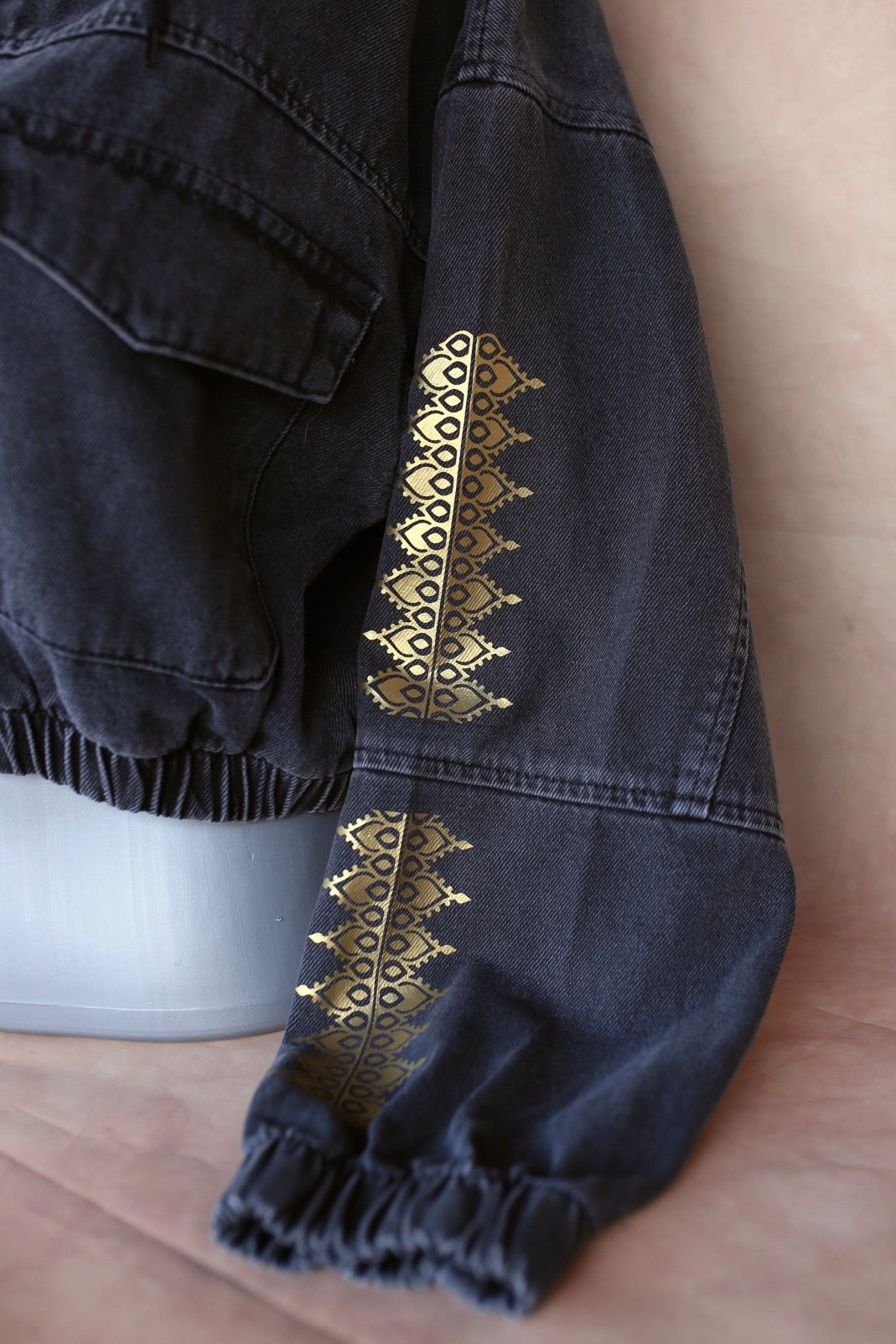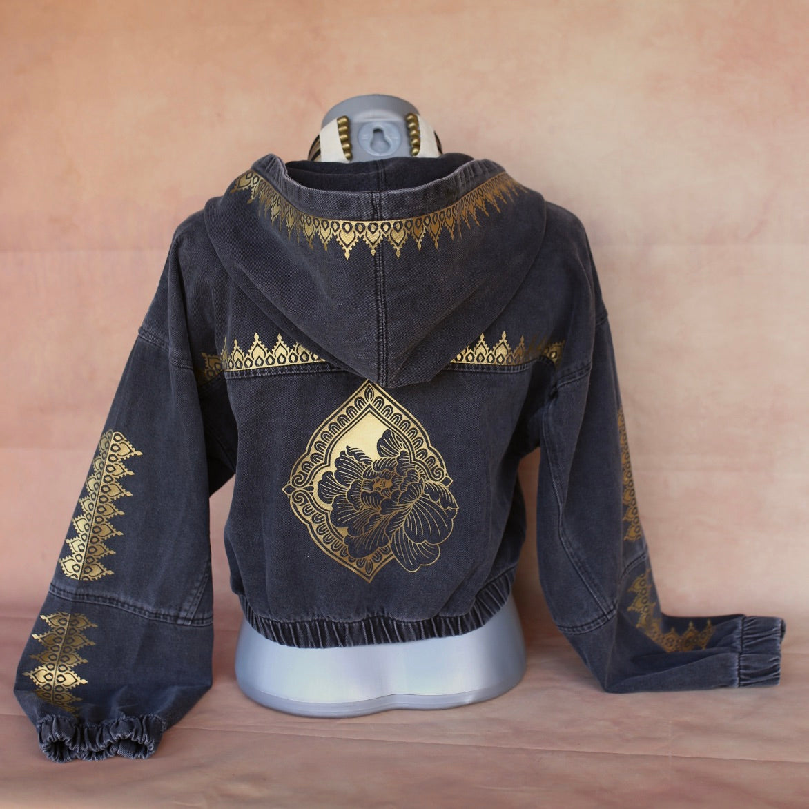 Cette veste en jean, coupe courte et resserrée à la taille, se distingue par ses motifs dorés sur les manches et la capuche, ainsi qu’un grand portrait ornemental au dos qui en fait une véritable œuvre d’art à porter. Sa capuche pratique et sa fermeture zippée ajoutent confort et modernité à ce modèle au style affirmé.