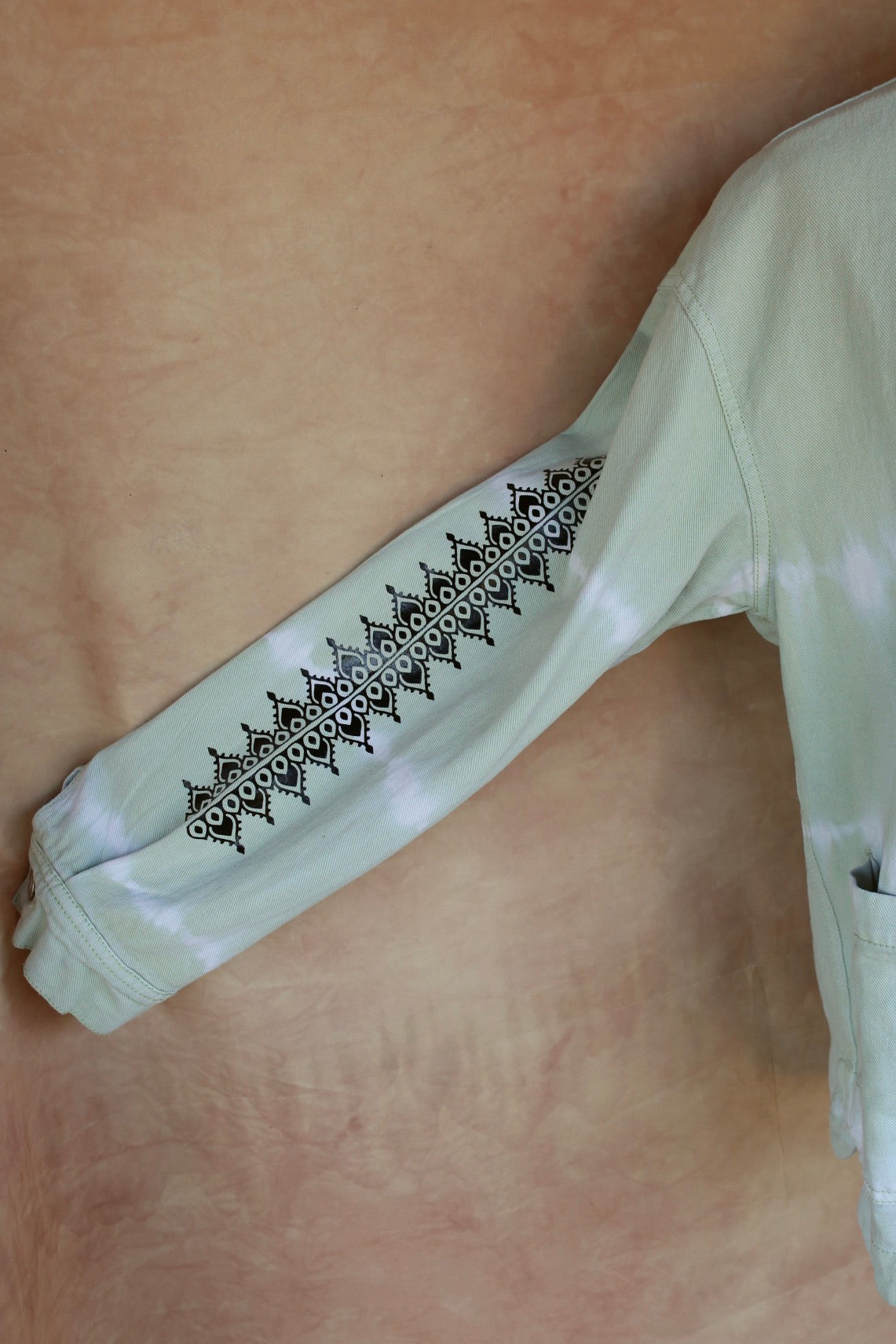 Une pièce unique qui mêle effet tie and dye artisanal et motifs tribaux peints à la main. Cette veste en jean claire se distingue par ses nuances délavées blanches et ses ornements noirs qui apportent une touche bohème et graphique.