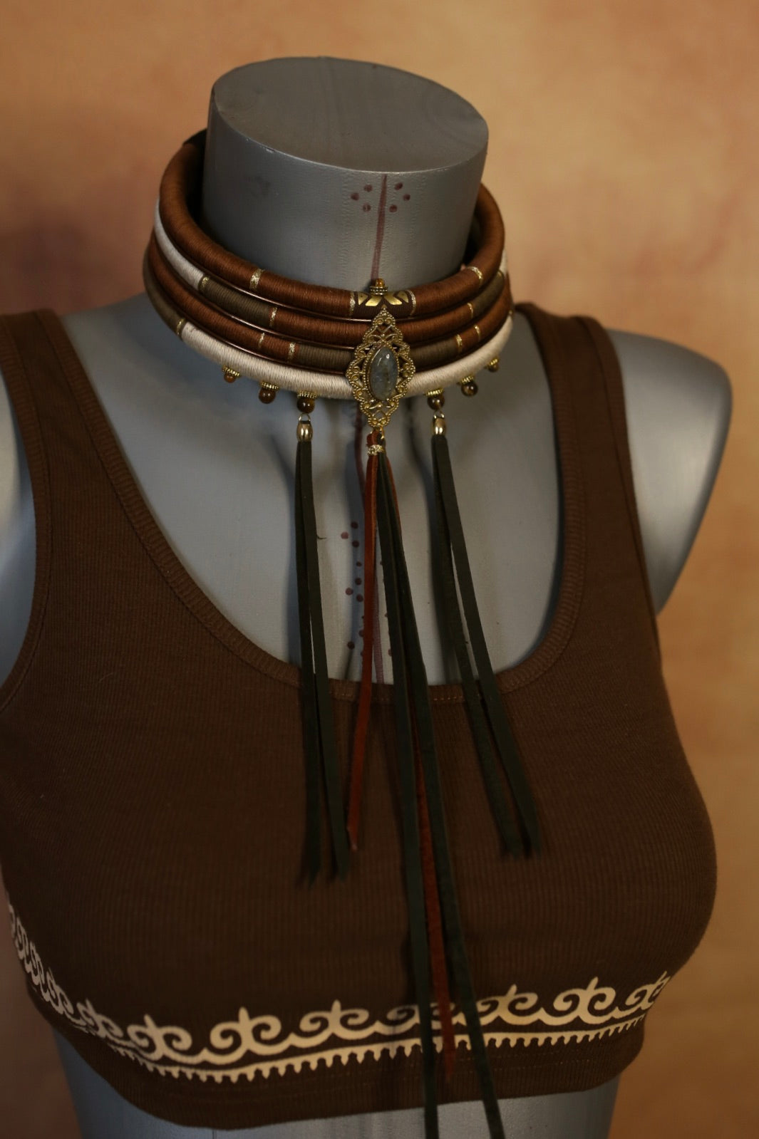 Au centre, un médaillon travaillé en laiton doré orné d’une labradorite naturelle vient capter la lumière. Les longues lanières en cuir prolongent la silhouette avec élégance et caractère.