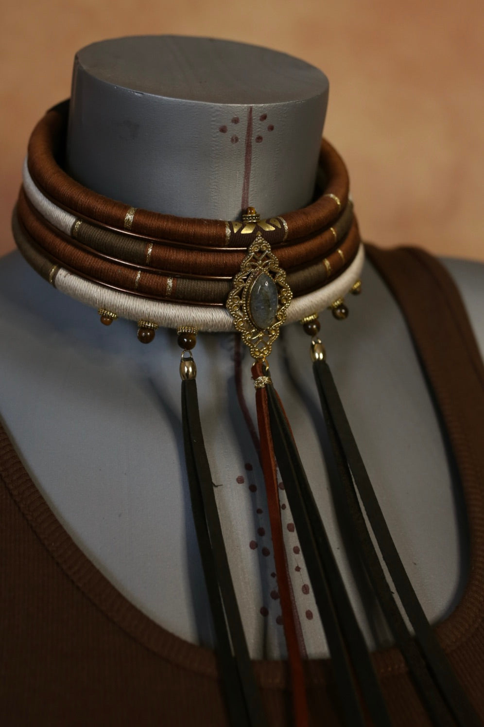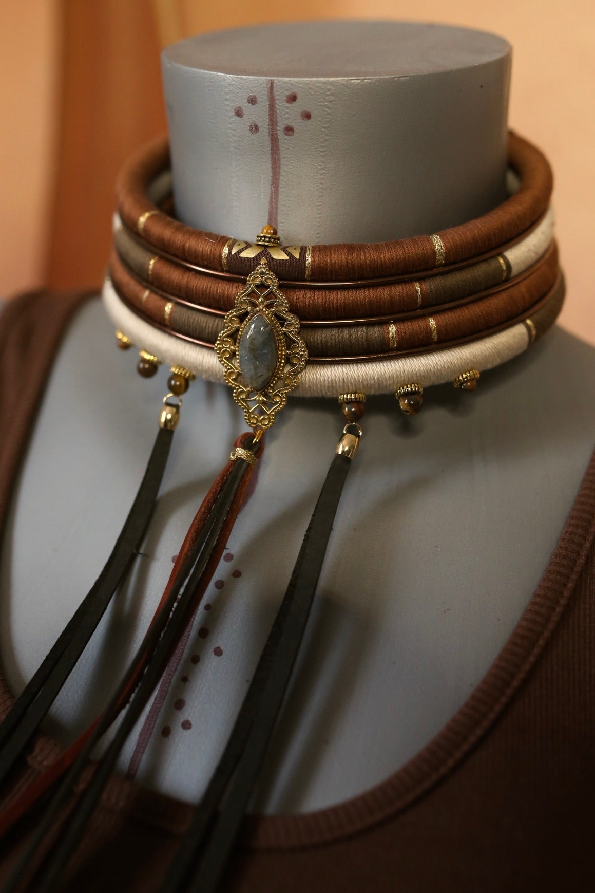 fil de coton brun, kaki et ivoire, soulignés de détails dorés et de perles naturelles suspendues.