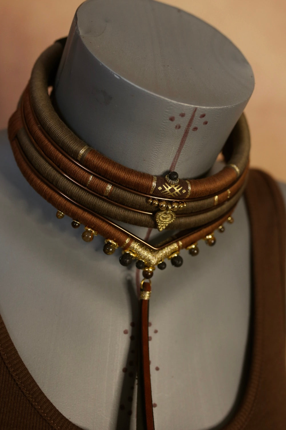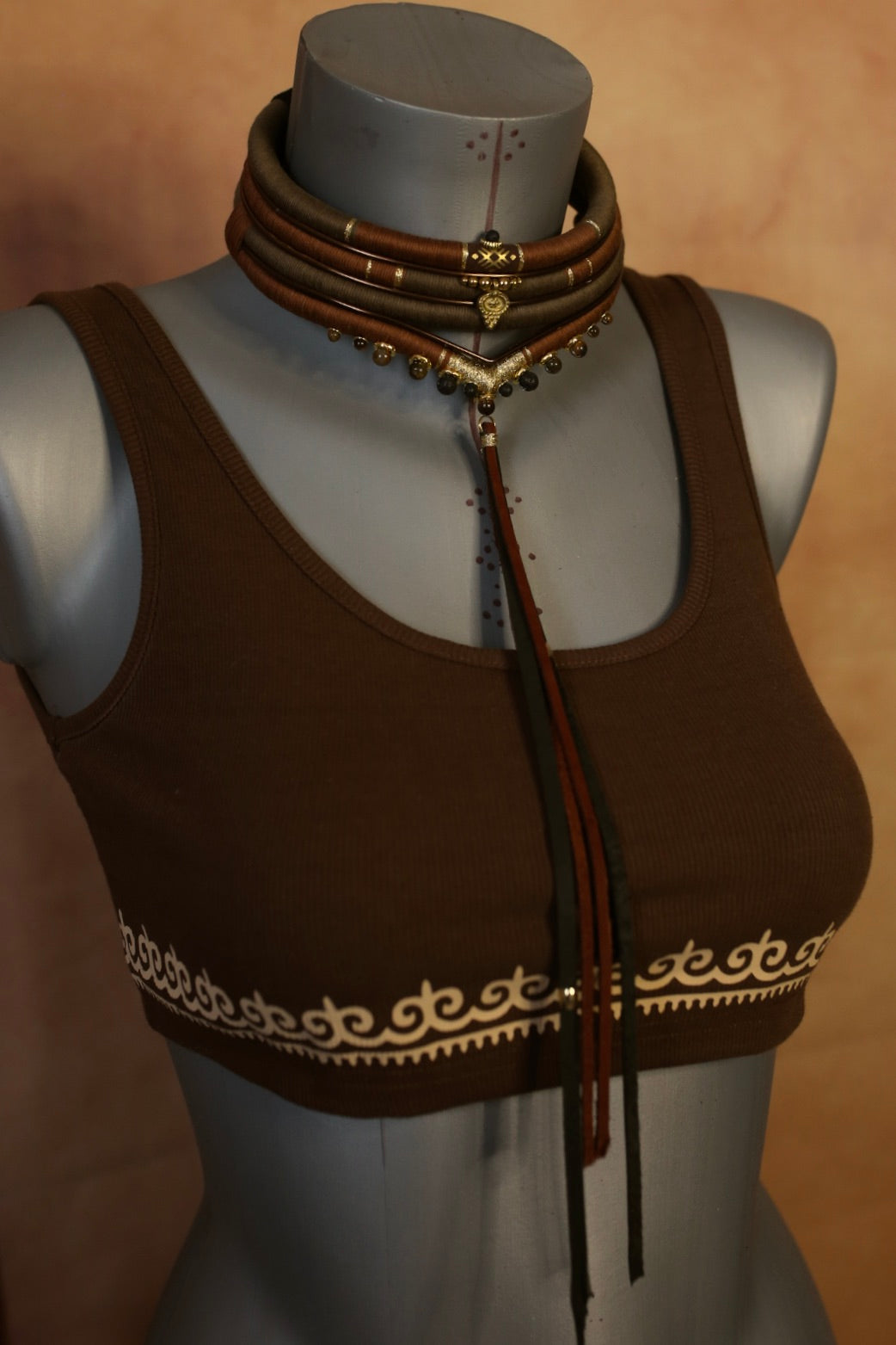 Au centre, un motif talisman en laiton doré vient structurer l’ensemble, prolongé par de fines lanières en cuir qui élancent la silhouette.