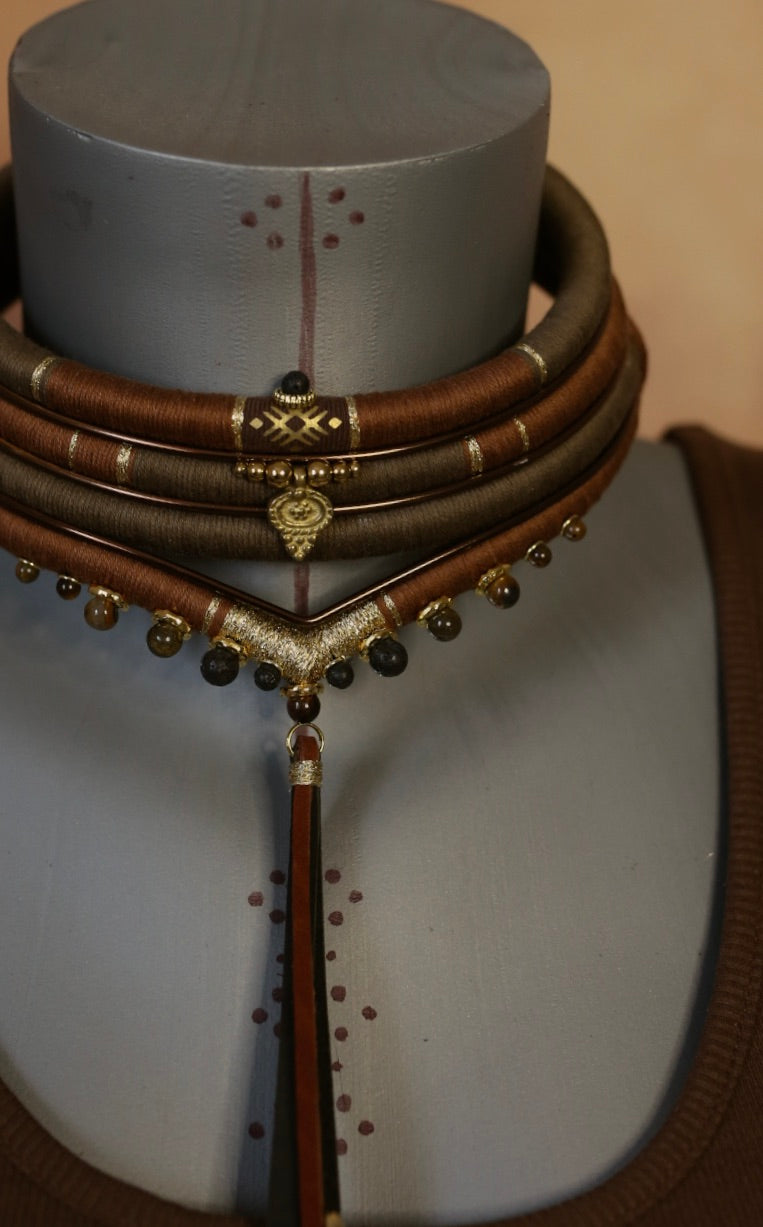 Collier a quatre rangs brun et kaki, soulignés de détails dorés et de perles naturelles suspendues 5oeilr de tigre et pierre de lave noir).