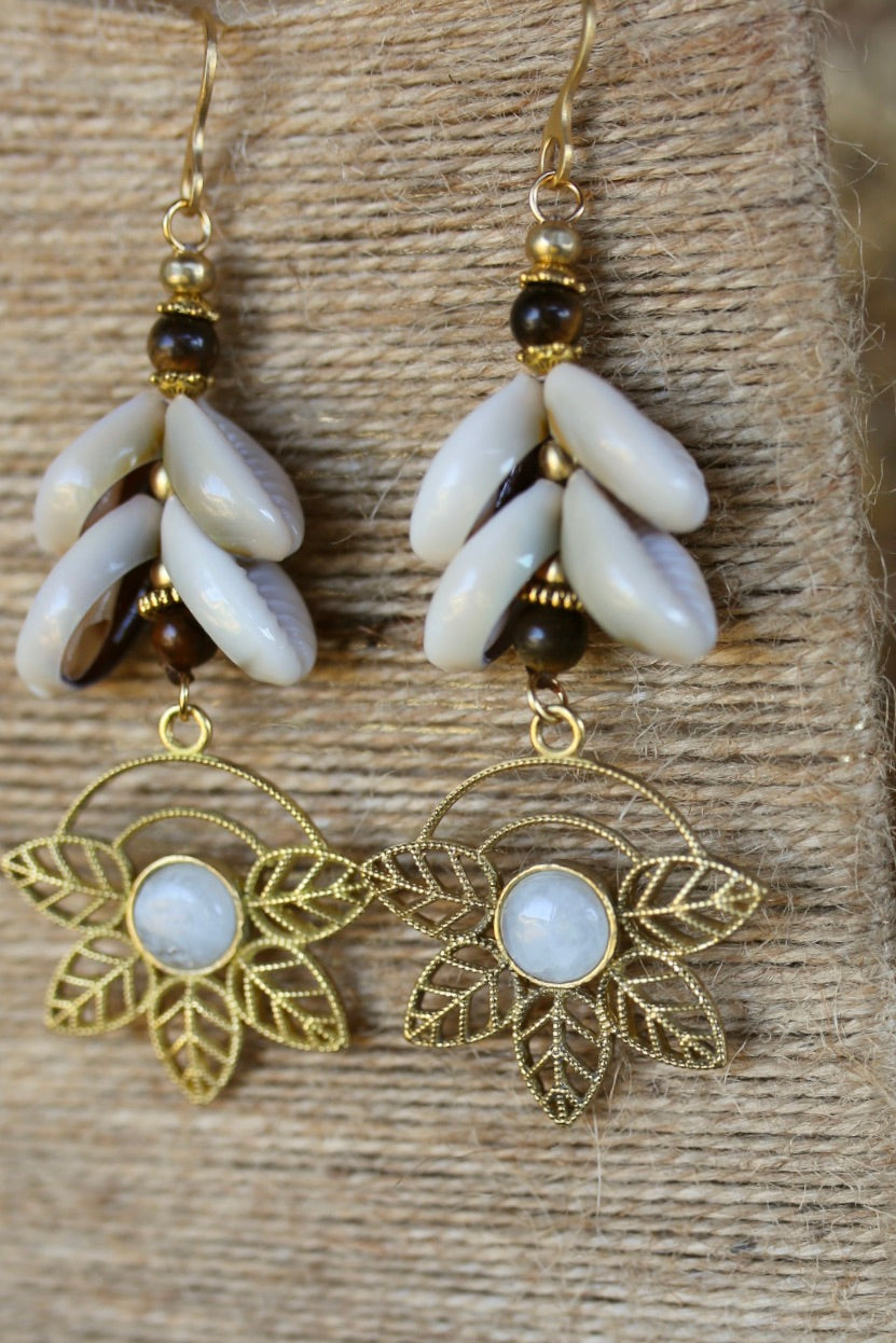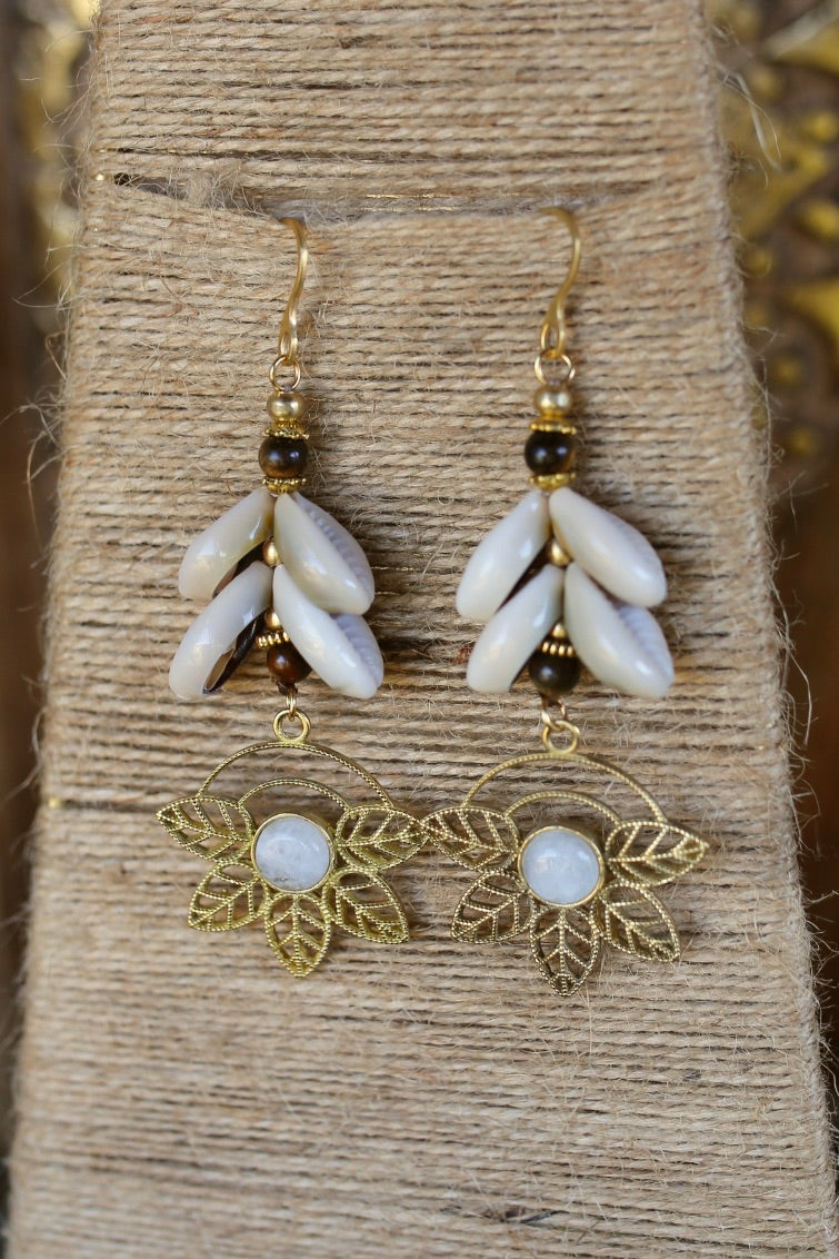 Inspirées par la nature et les éléments marins, ces boucles d’oreilles mêlent harmonieusement coquillages naturels et pendentifs en laiton doré finement ciselés en forme de feuilles. Au centre, une pierre de lune apporte une touche mystique et lumineuse. Un bijou délicat, entre mer et forêt.