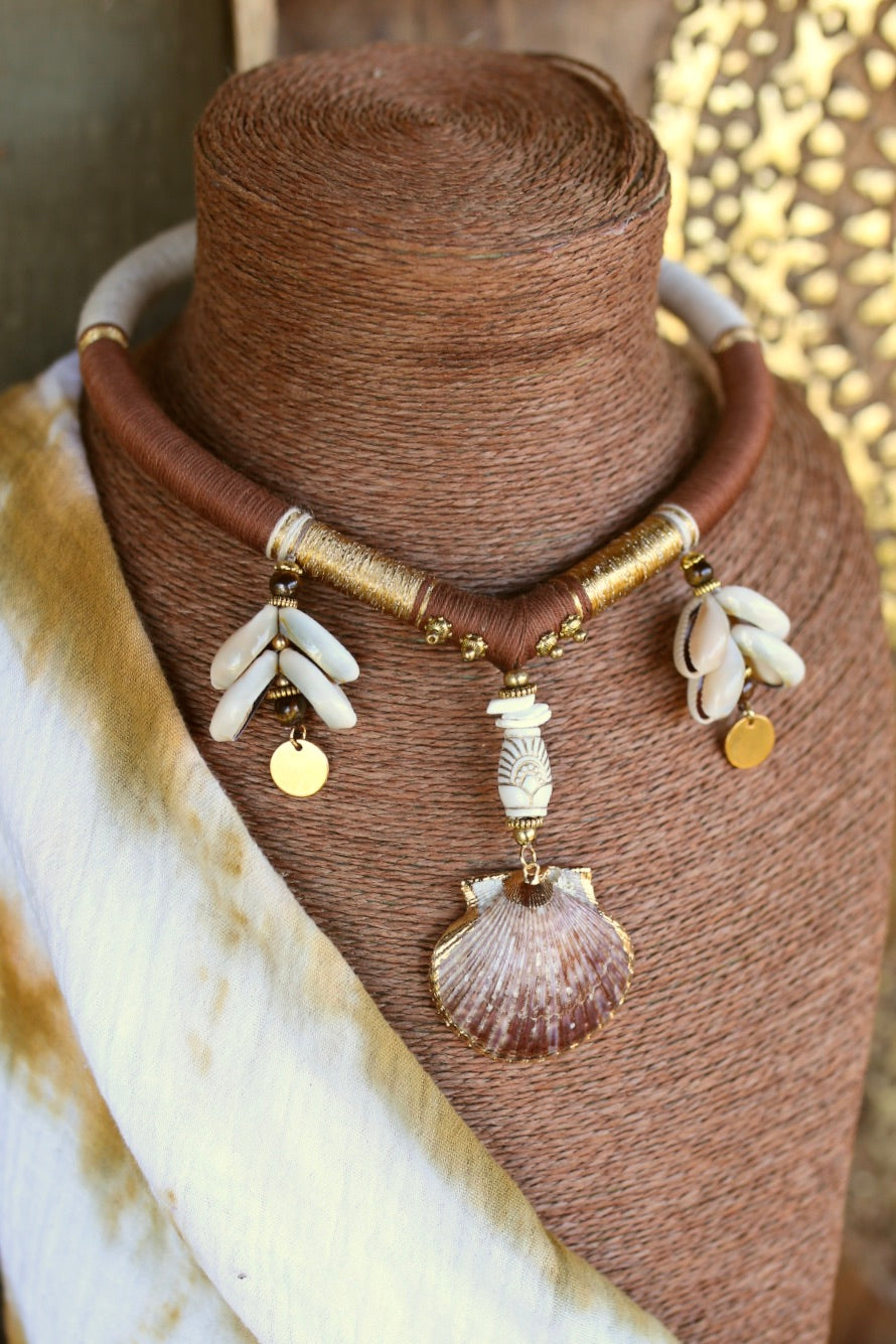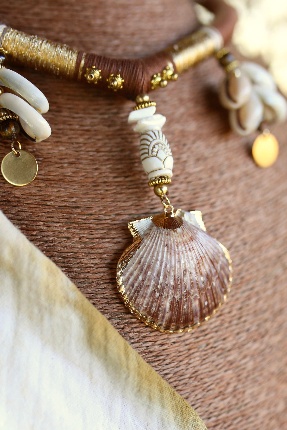 Conçu à la main avec des fils dorés, des broderies inspirées des motifs ethniques et des coquillages cousus un à un, il se distingue par son pendentif central : une véritable coquille Saint-Jacques bordée de laiton doré, montée sur des perles gravées.