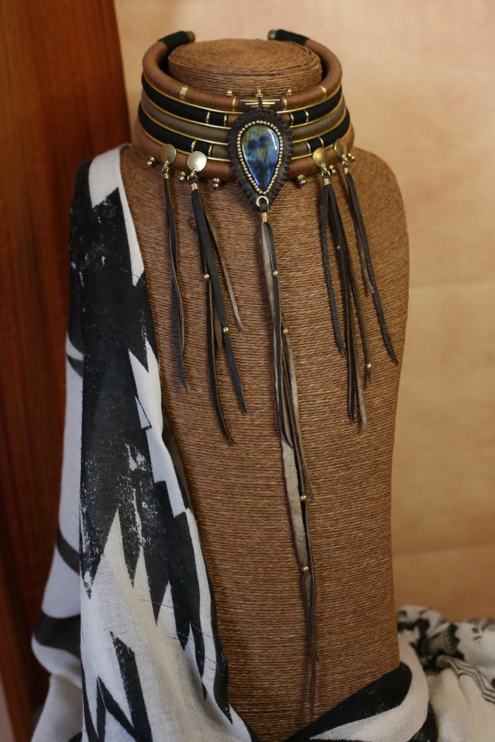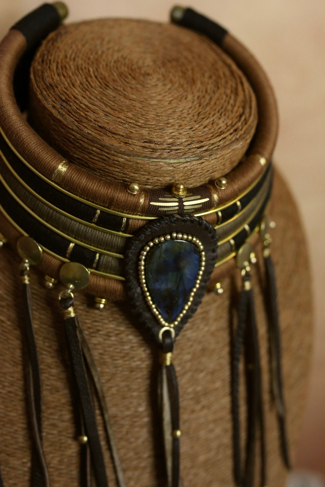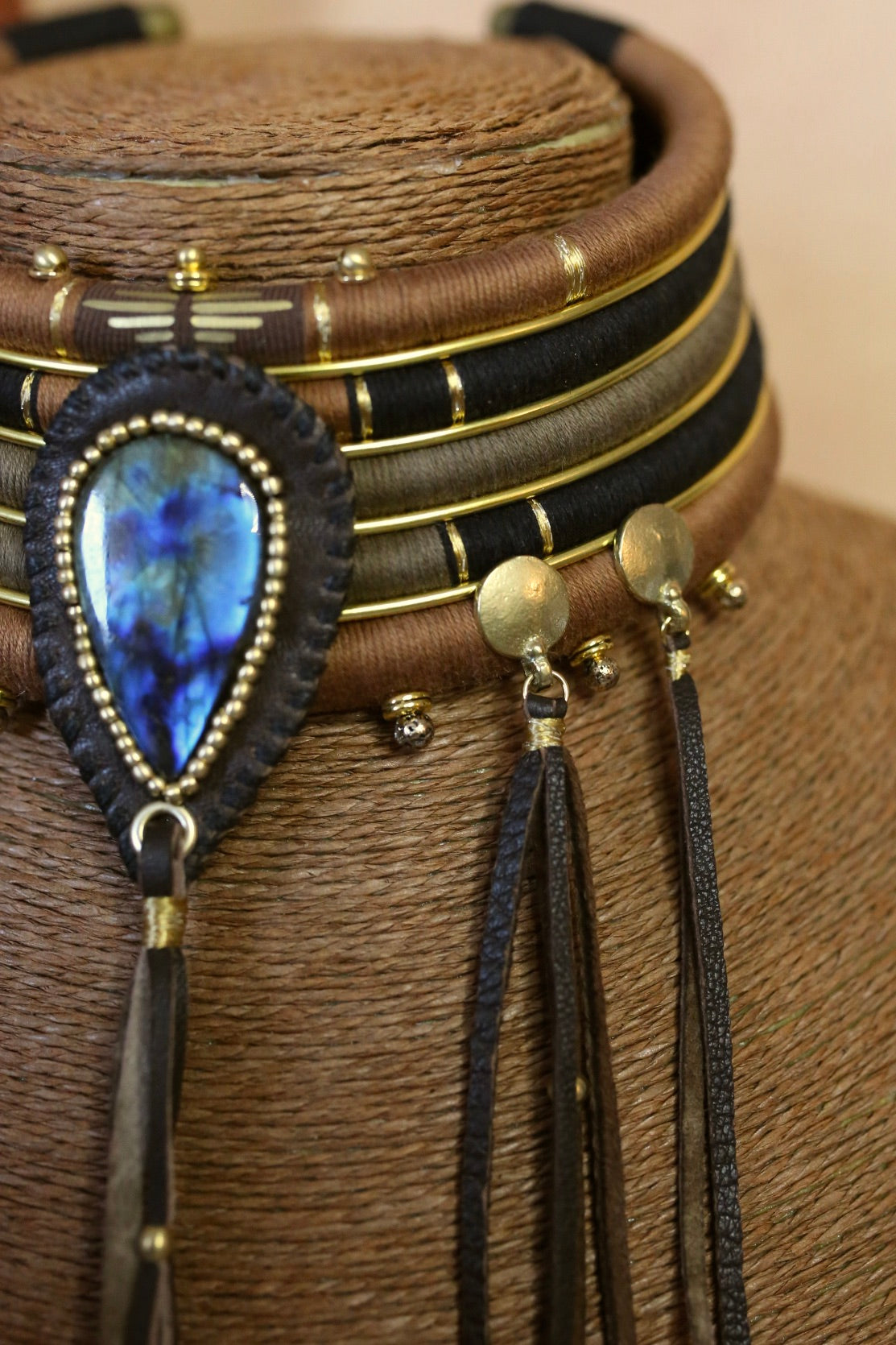 Un collier au style western/ethnique, composé de 5 rangs amovibles qui se superposent parfaitement. Au centre, une labradorite aux reflets bleus profonds vient capter la lumière, entourée de détails dorés. Les franges en cuir faites à la main 5 32 cm pour les plus longues) et les petits ornements apportent du mouvement et une allure sauvage ultra féminine.
