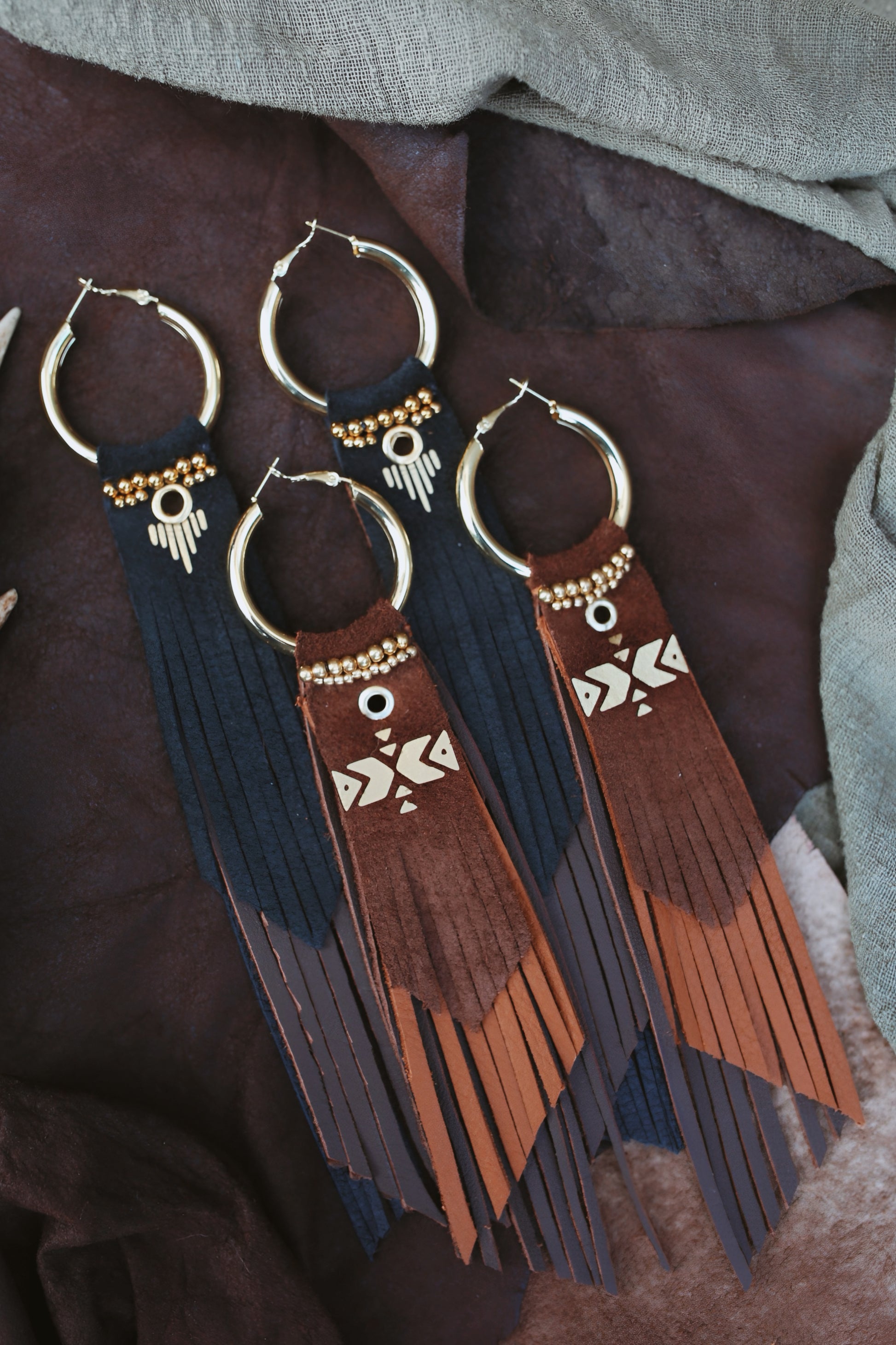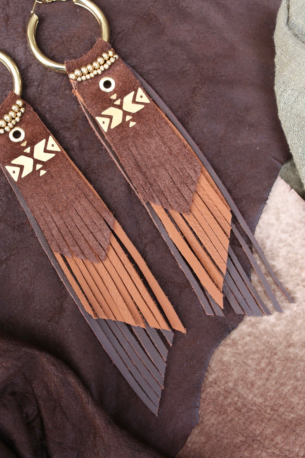 Une paire au caractère western assumé, composée d’une base en acier inoxydable et de franges en cuir faites à la main, en camaïeu de bruns profonds. J’y ai ajouté mes motifs dorés signature, pour une touche ethnique et lumineuse qui attire tout de suite l’œil.