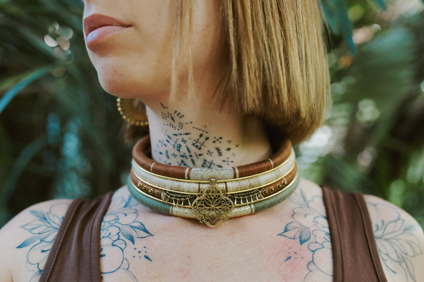 J'ai crée cette collection de bijoux avec des pendentifs en laiton. Ainsi qu’avec des tissu en lin. Les bijoux sont tous unique et fabriquer a la main.