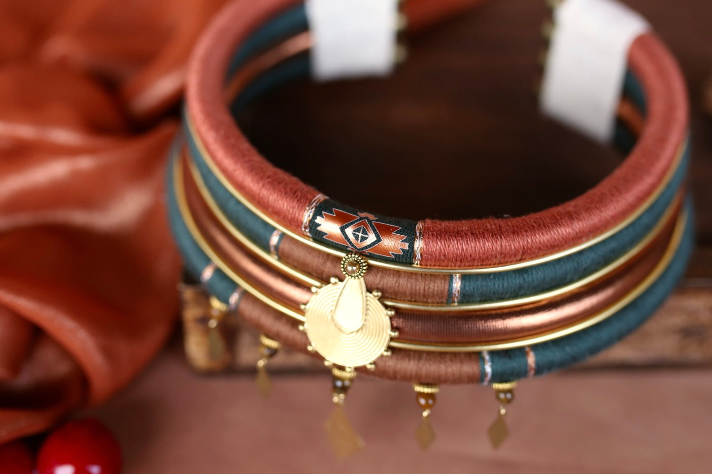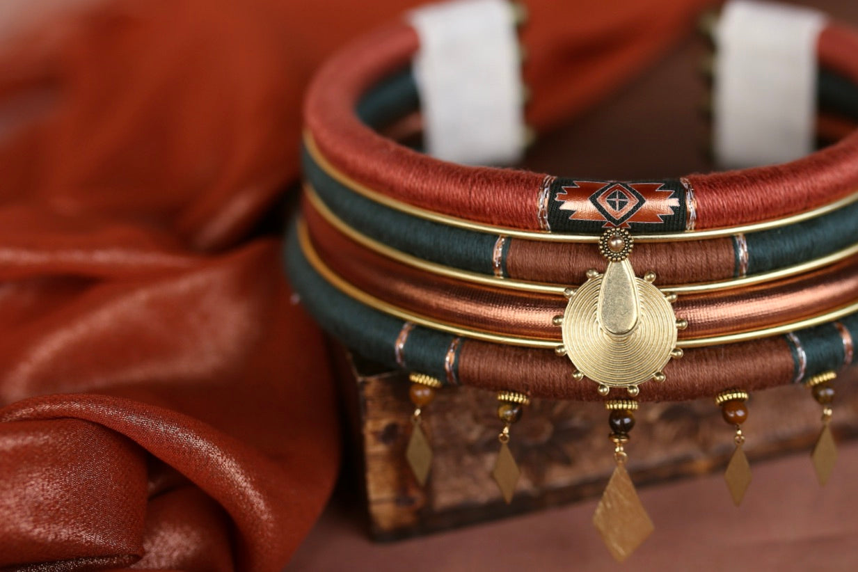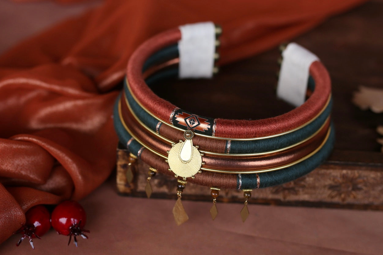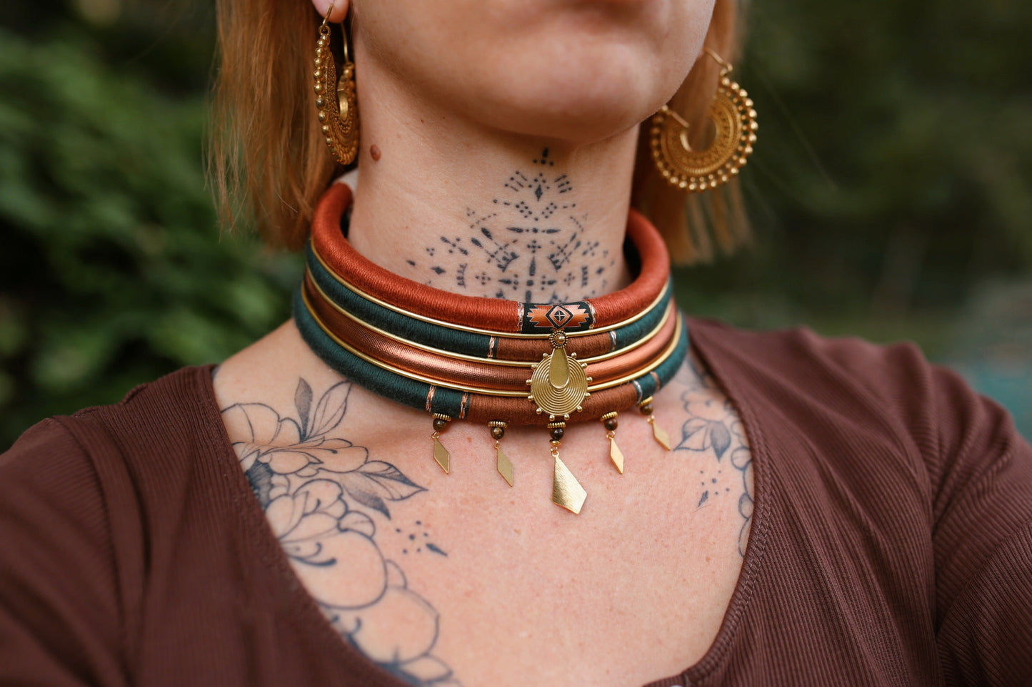 J'ai crée cette collection de bijoux avec des pendentifs en laiton et bronze. Ainsi qu’avec des tissus que j'ai crée grâce aux sublimes ornements inspiré des tribus navajos. Les bijoux sont tous unique et fabriquer a la main.