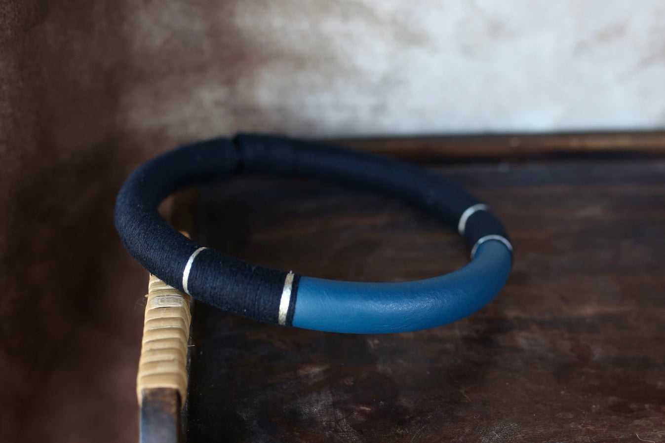 J'ai confectionné ce collier torque avec un fil de coton noir et doré. Ainsi qu'avec du simili cuir bleu pétrole.