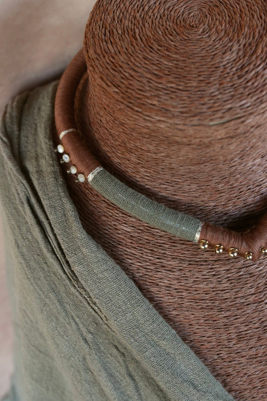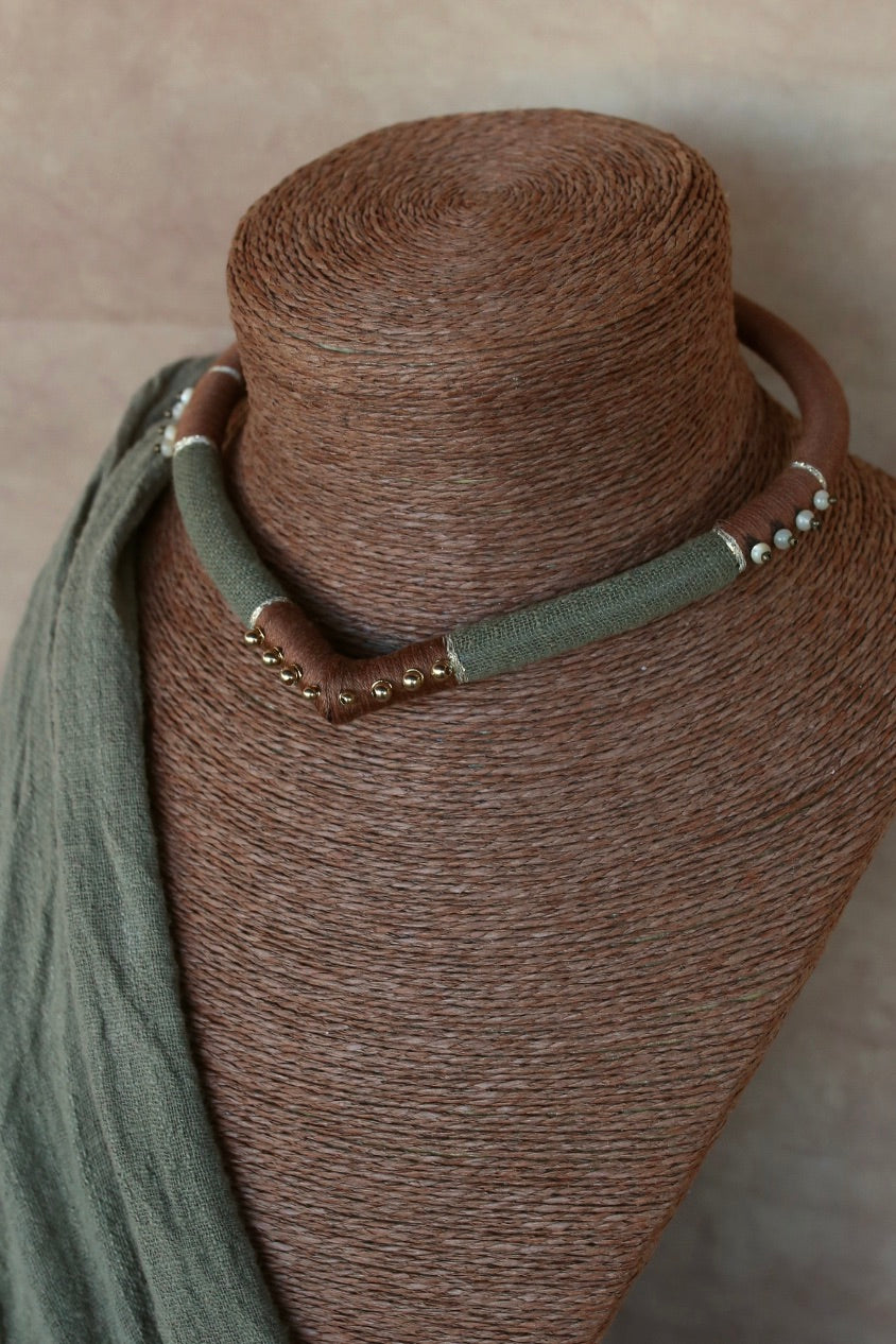 J'ai confectionné ce collier avec du fil 100% coton de couleurs marron, kaki et une touche de doré.