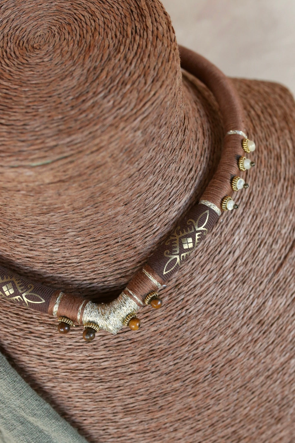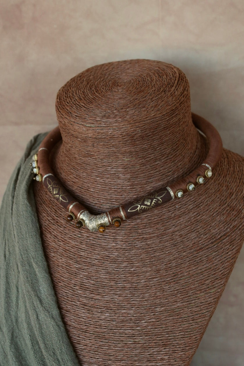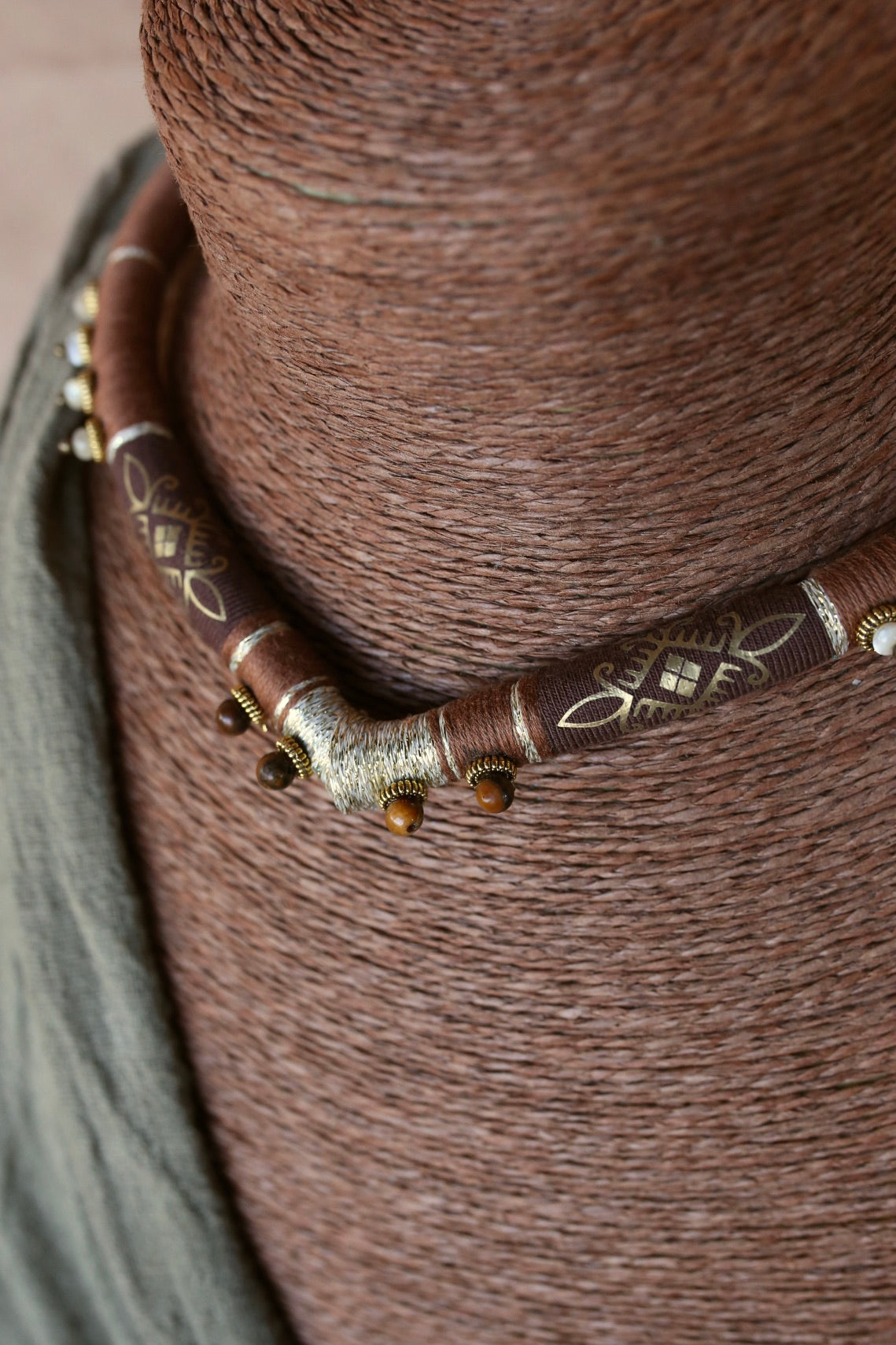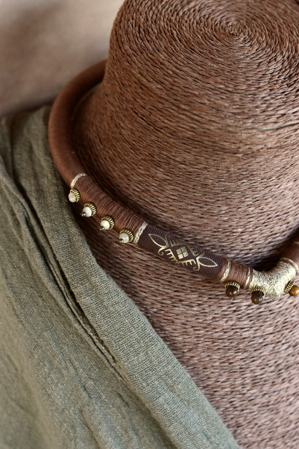 J'ai confectionné ce collier avec du fil 100% coton de couleurs marron, kaki et une touche de doré.