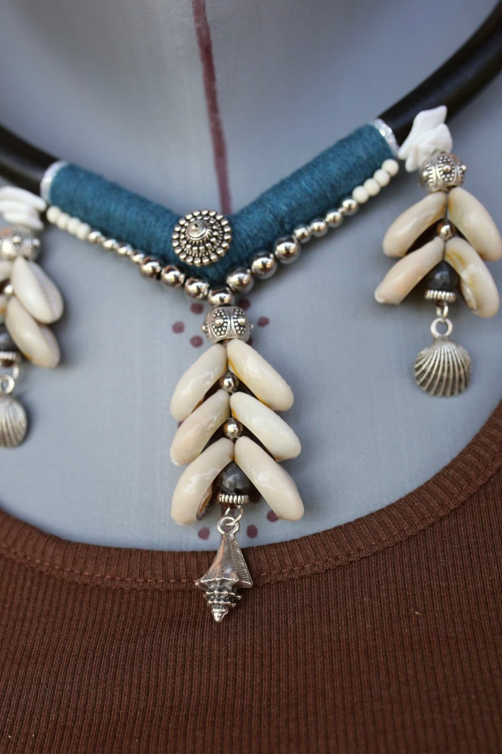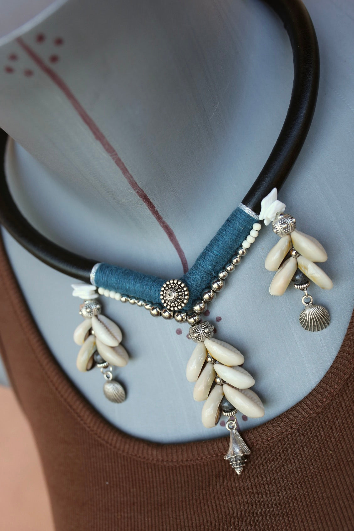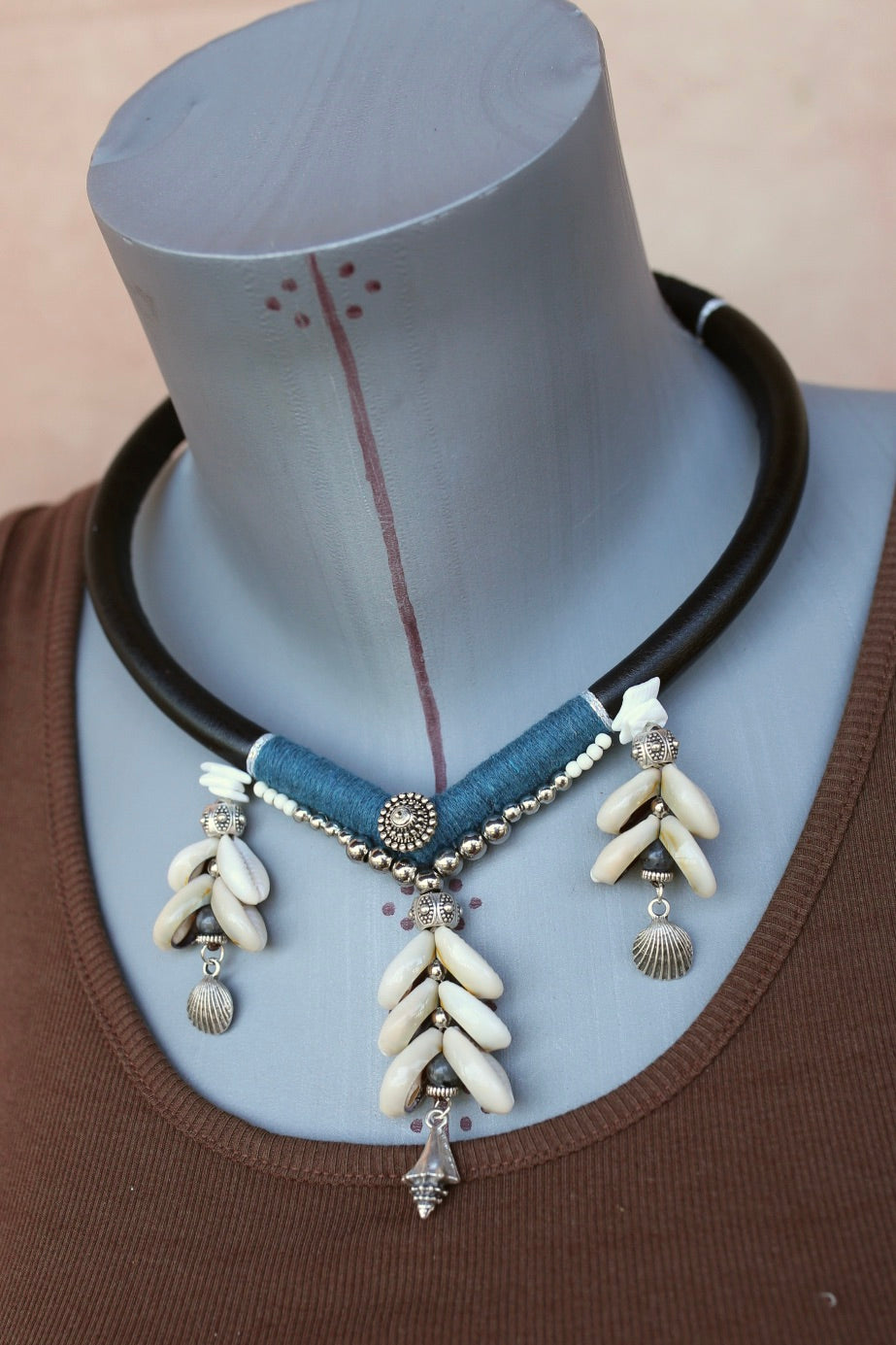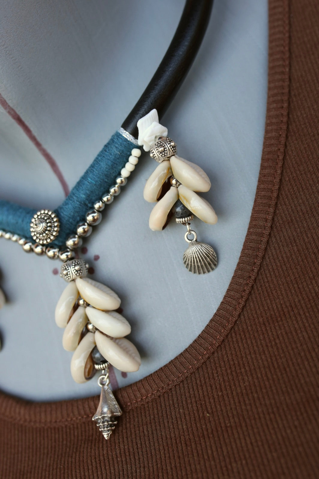 Torque en simili cuir noir orné de fils bleu océan et perles argentées, décoré de pendentifs en coquillages naturels et breloques en forme de coquilles. Une pièce au charme marin et artisanal, parfaite pour évoquer l’esprit des rivages.