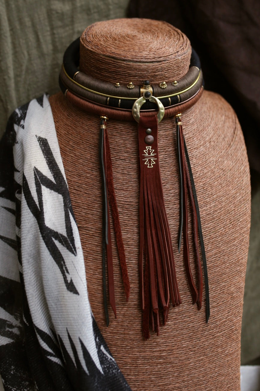 Collier à trois rangs, amovible, mêlant cuir et laiton doré dans un esprit western tribal.