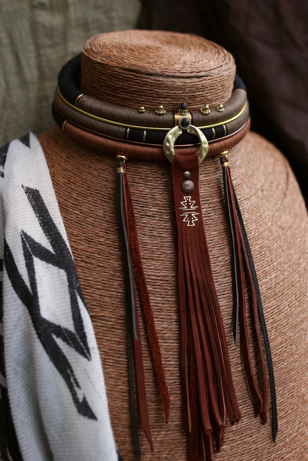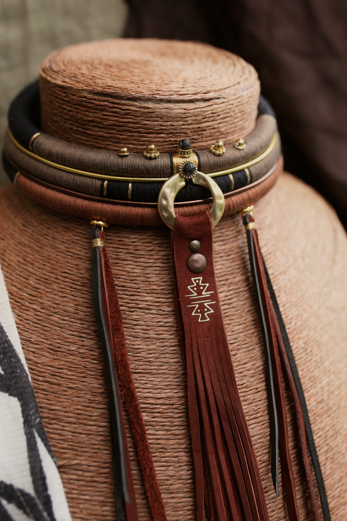 La pièce centrale en cuir est soulignée d’un anneau en laiton, de motifs dorés et de franges découpées à la main, apportant mouvement et caractère.