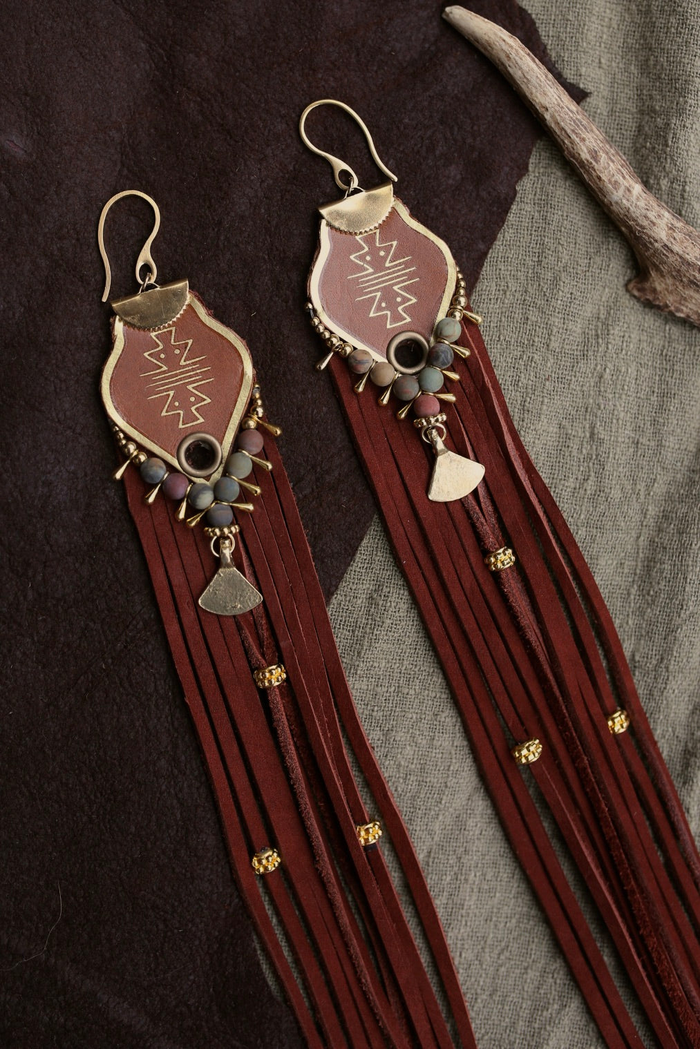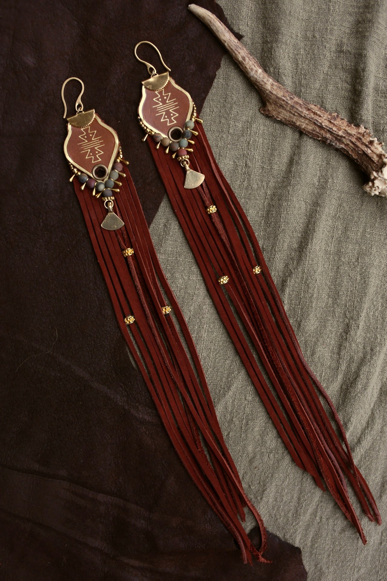 La partie supérieure est ornée de motifs dorés, de perles minérales, de petits éléments en laiton et d’un pendentif central, tandis que les franges longues découpées à la main apportent mouvement et intensité.