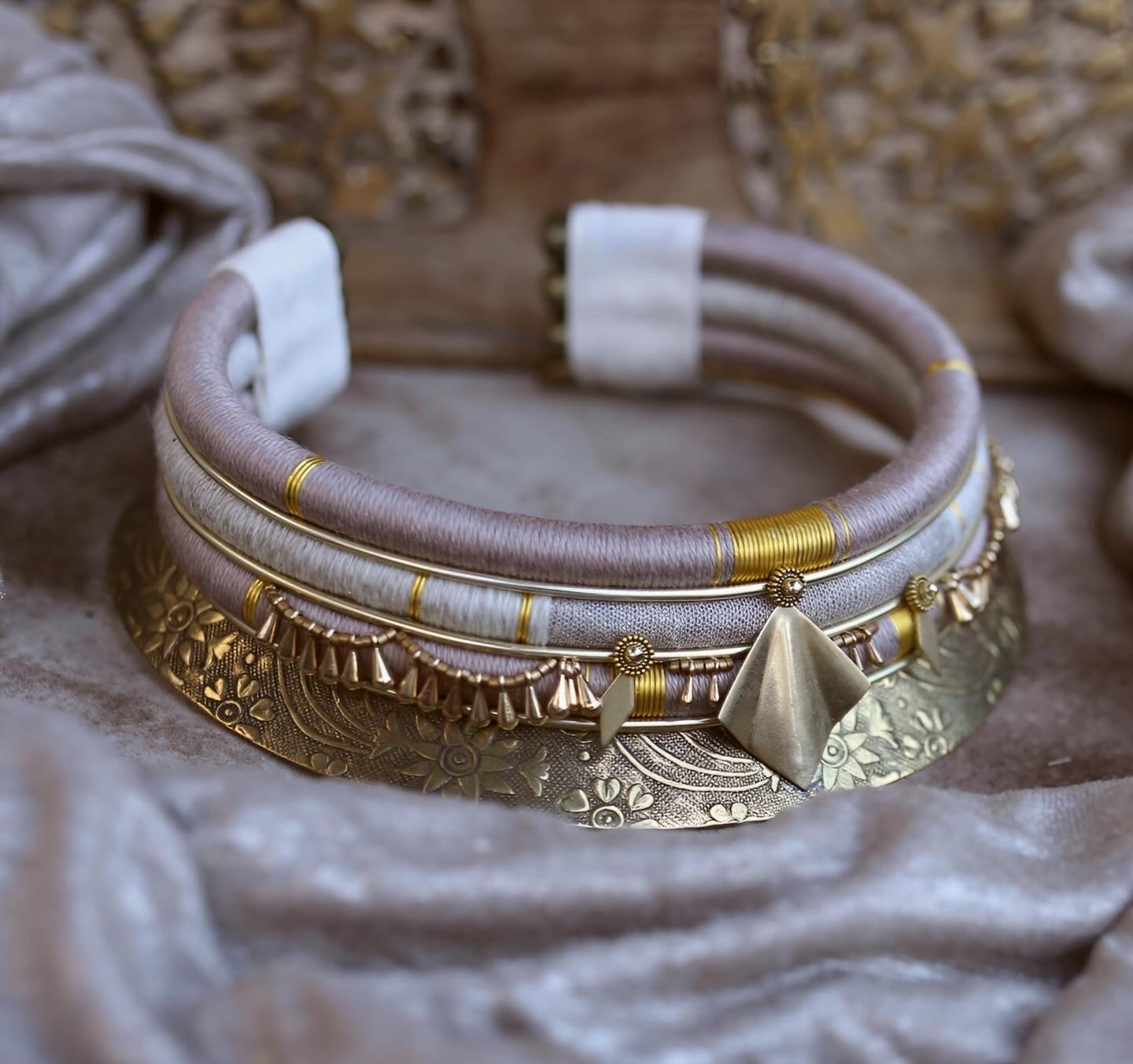 J'ai confectionné ce collier avec du fil 100% coton de couleurs beige, crème et une touche de doré. Le premier rang est un torque en laiton.