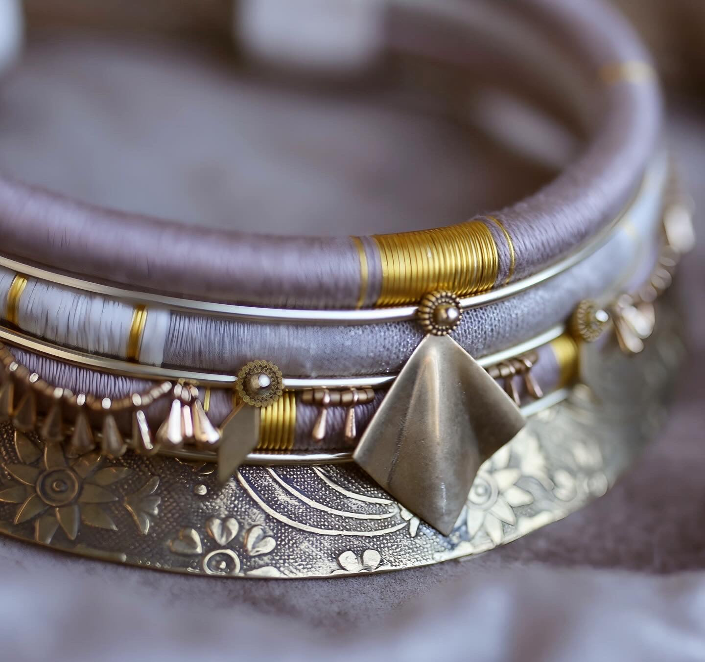 J'ai crée cette collection de bijoux avec des pendentifs en laiton et bronze. Ainsi qu’ avec des tissu irisé dore.