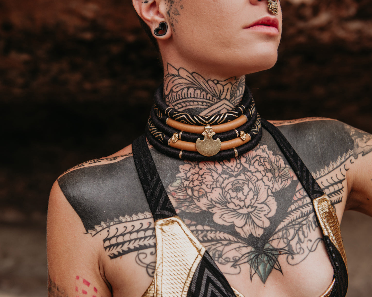 J'ai confectionné ce collier avec du tissu en simili cuir de couleur camel que j'ai cousu a la machine . Ainsi que du fil coton doré et noir.