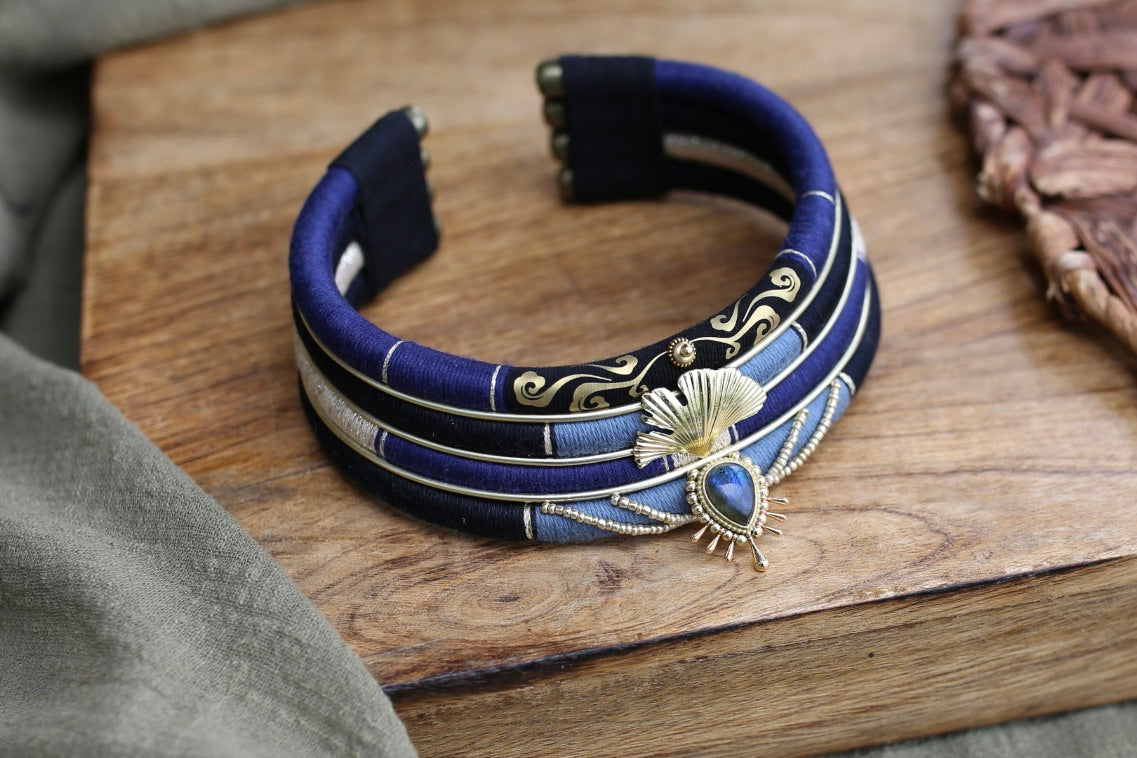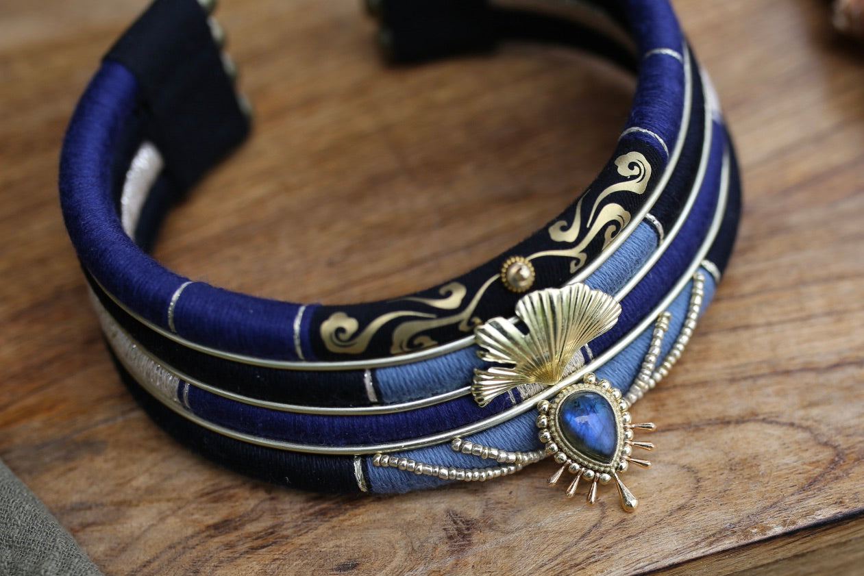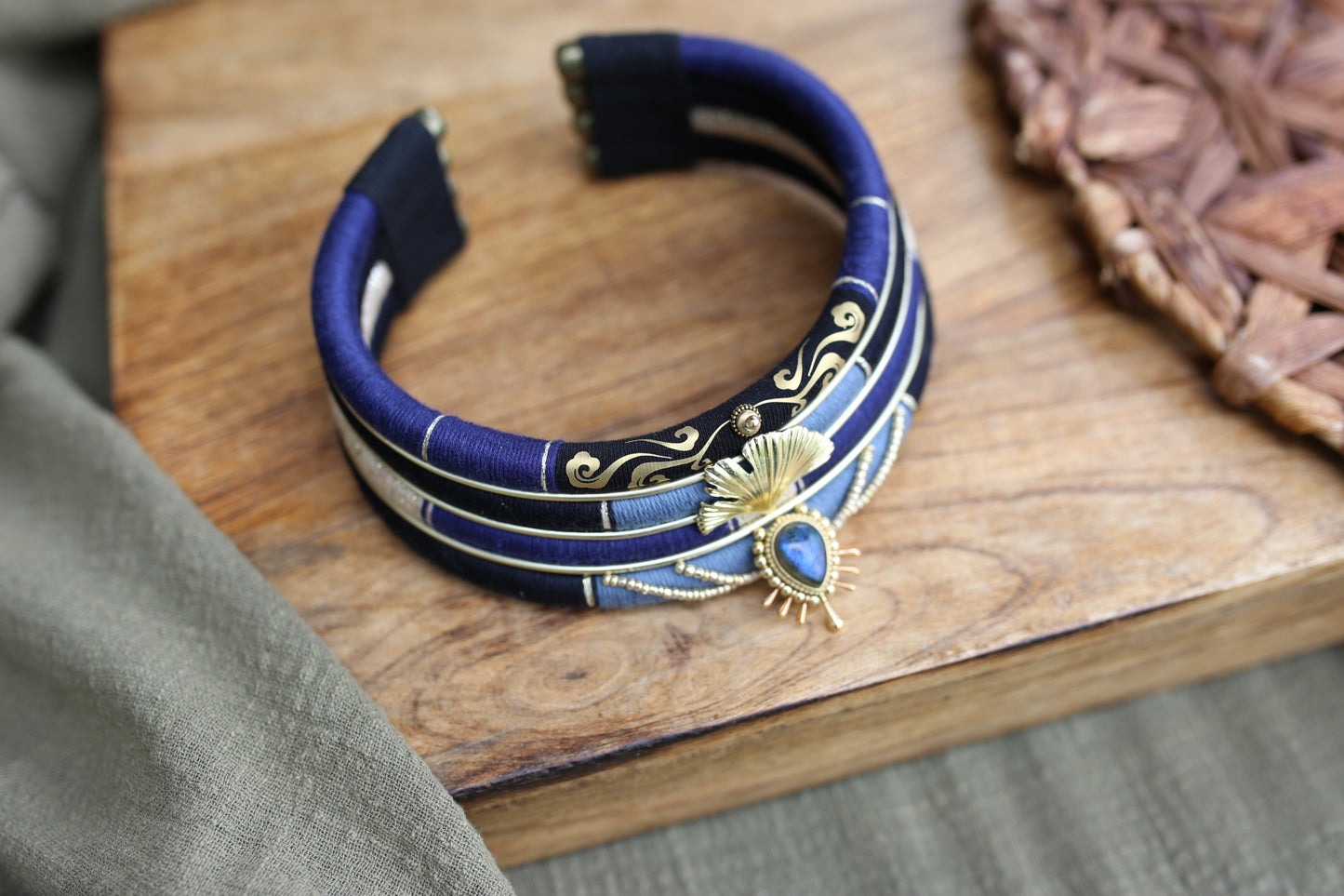 J'ai confectionné ce collier ras de cou avec un fil de coton noir, bleu et doré. Ainsi que du fil aluminium doré.