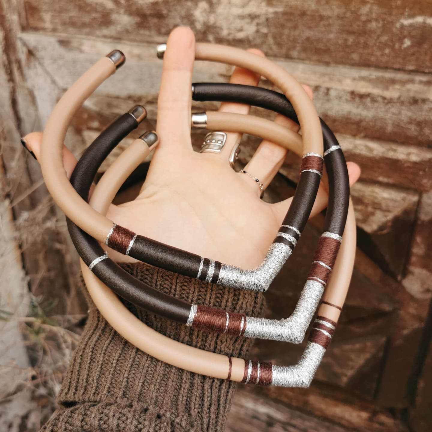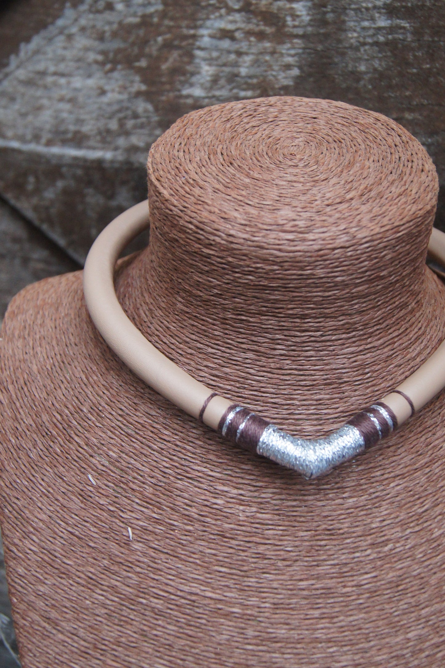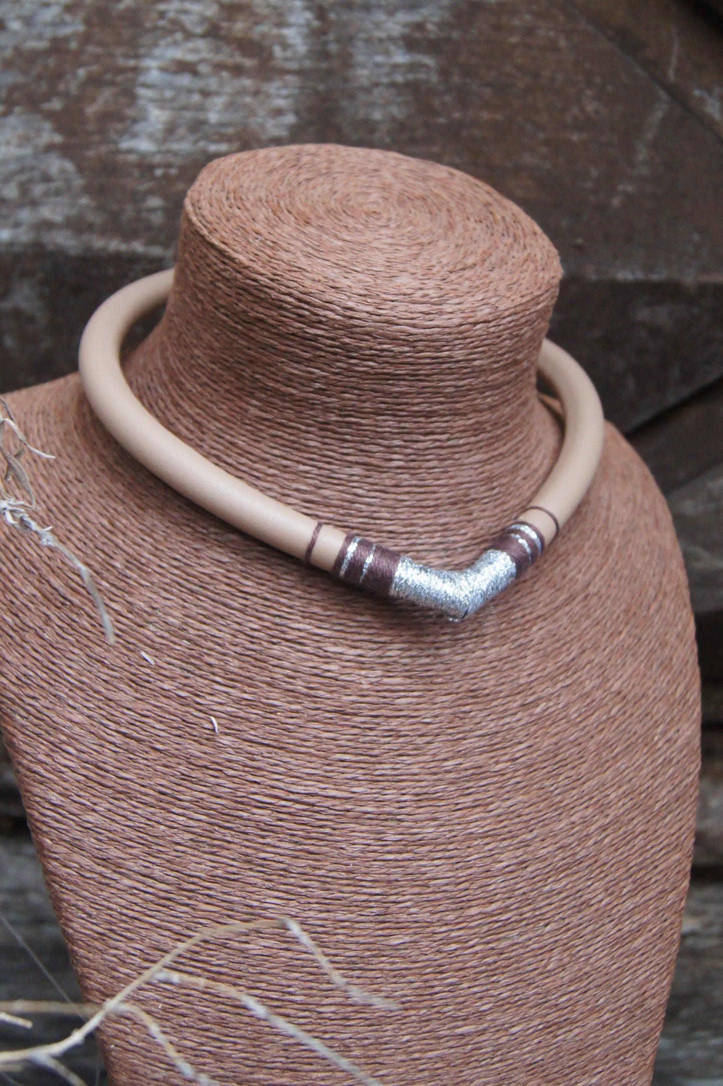 J'ai confectionné ce collier avec du tissu en simili cuir de couleur marron, bronze et beige que j'ai cousu a la machine .