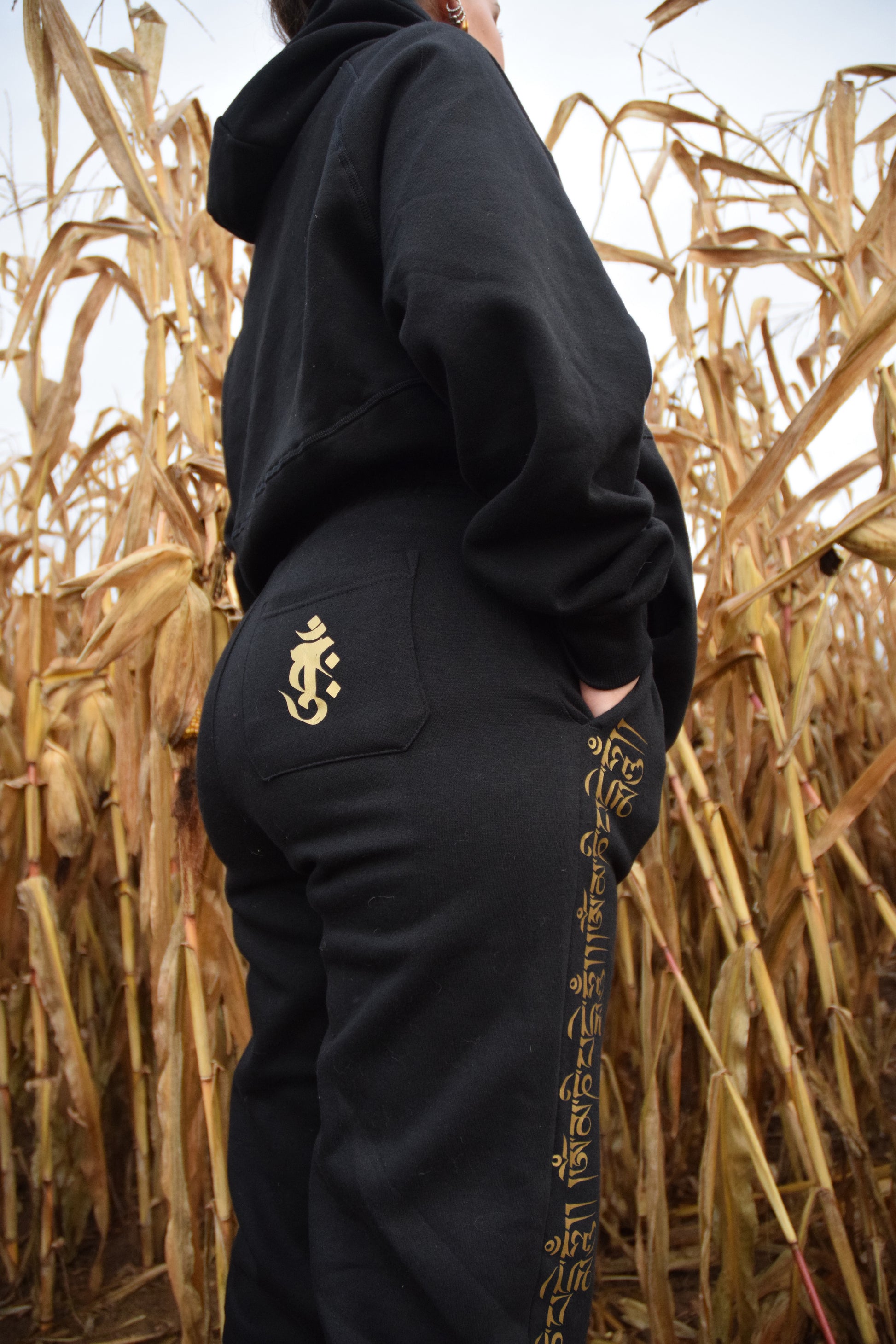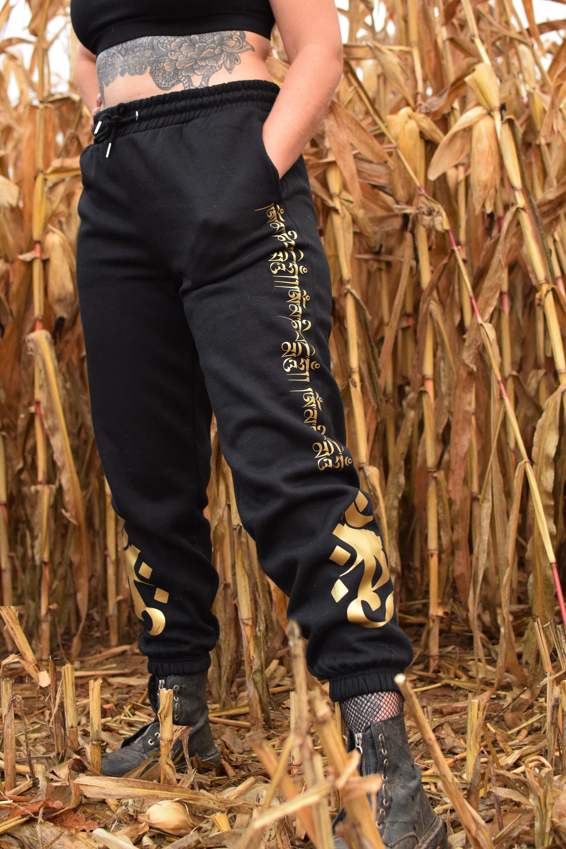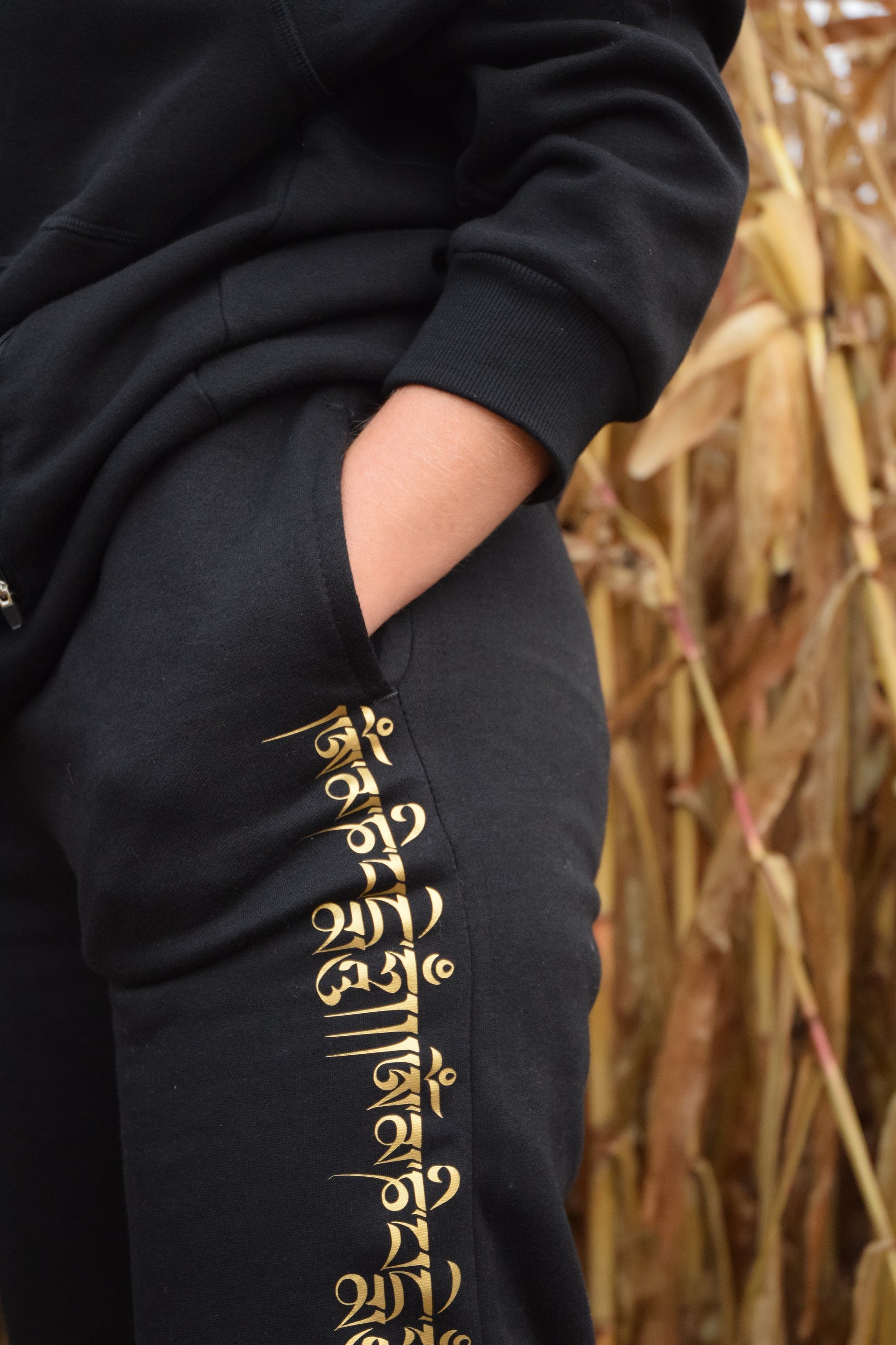 Confort et symbolisme se rencontrent dans ce jogging noir orné de mantras tibétains dorés, soigneusement appliqués à la main