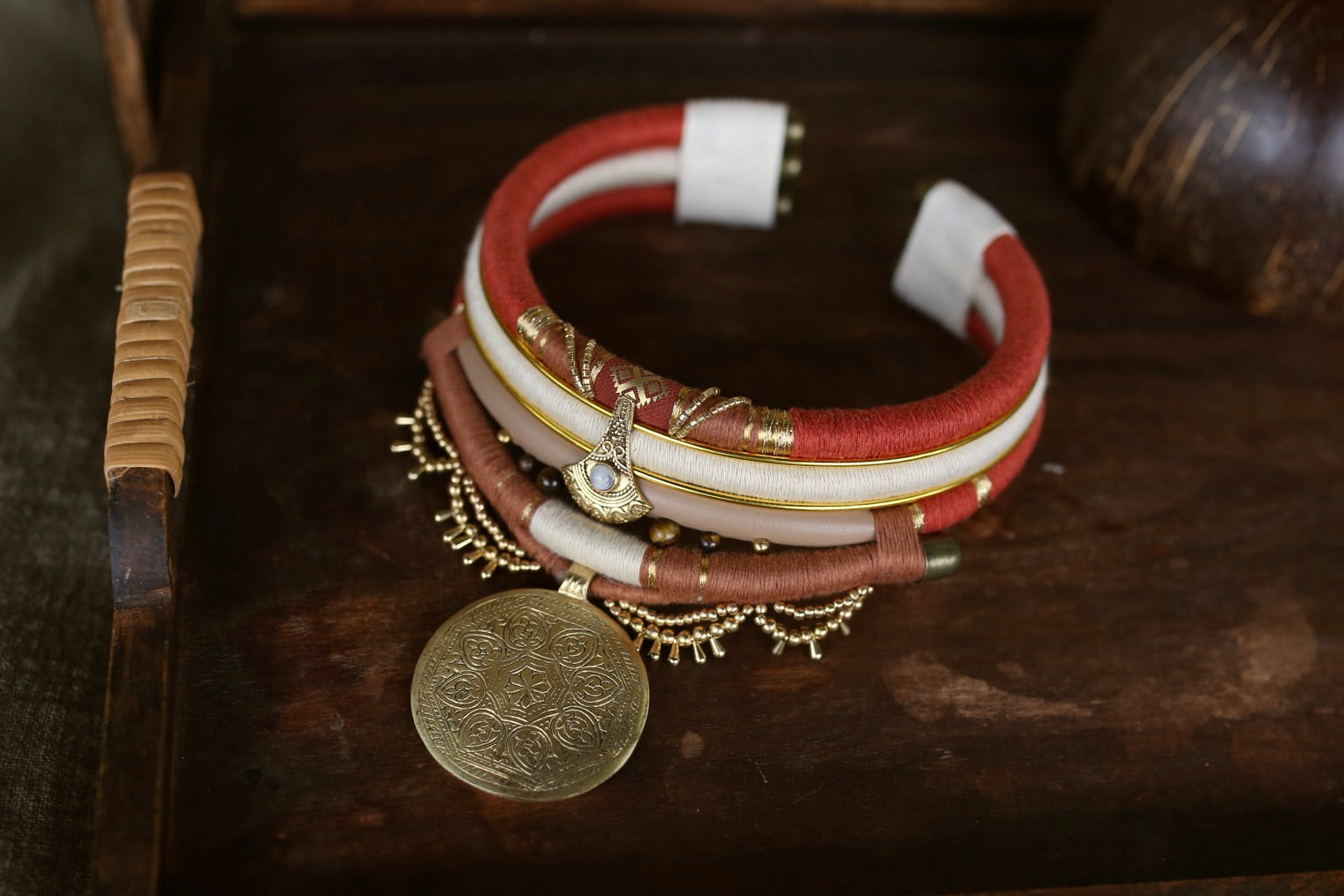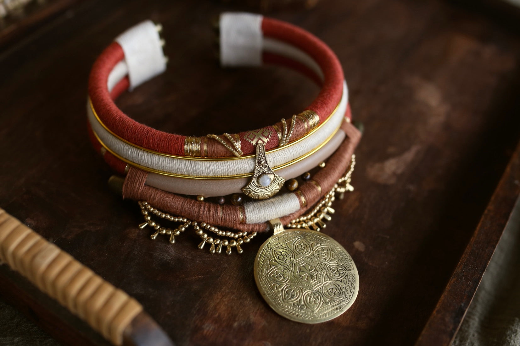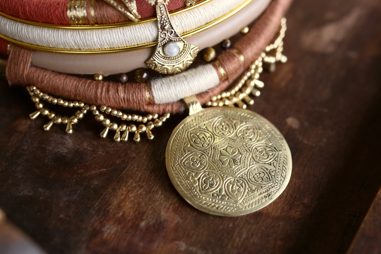 Collier ras-de-cou à quatre rangs dans les tons terracotta, beige et marron, sublimé par de délicates finitions dorées. Son grand médaillon en laiton gravé, associé à un petit pendentif serti, en fait une pièce majestueuse de la collection Mehndi Wild, entre tradition et élégance sauvage.