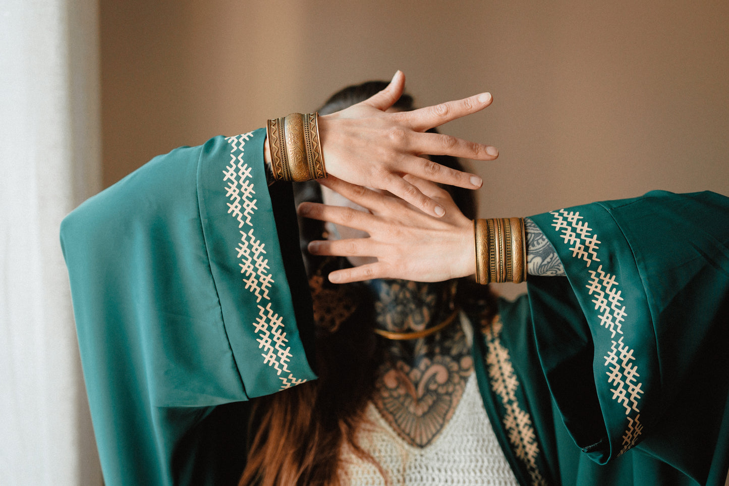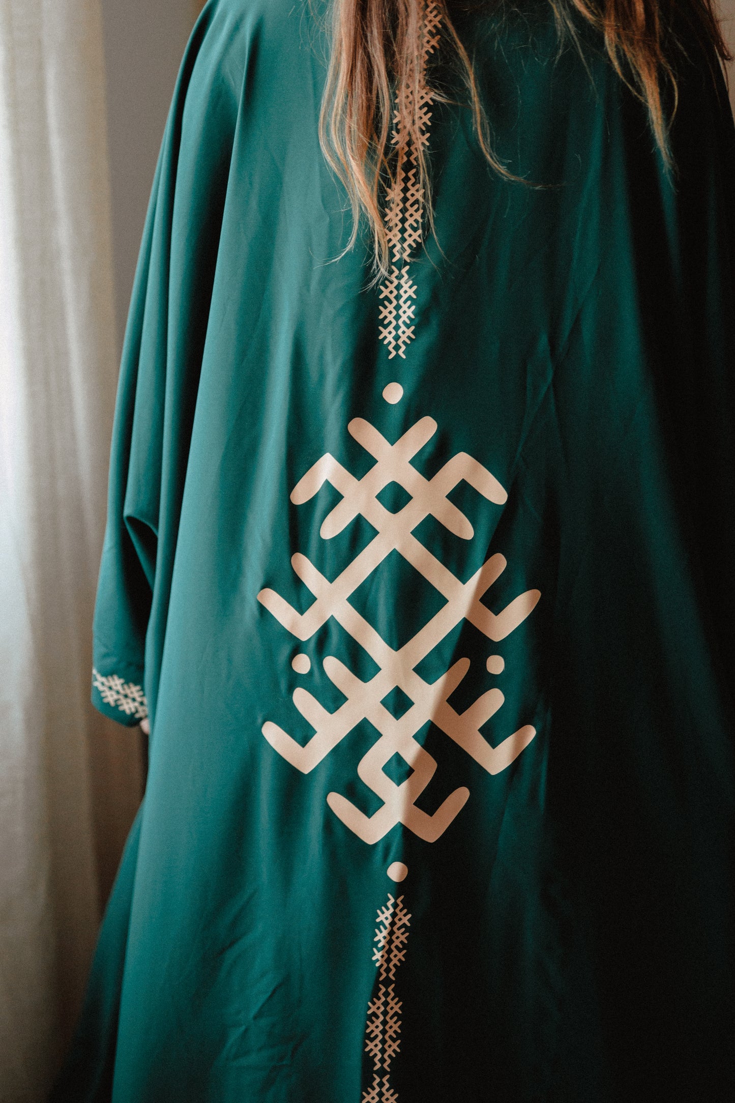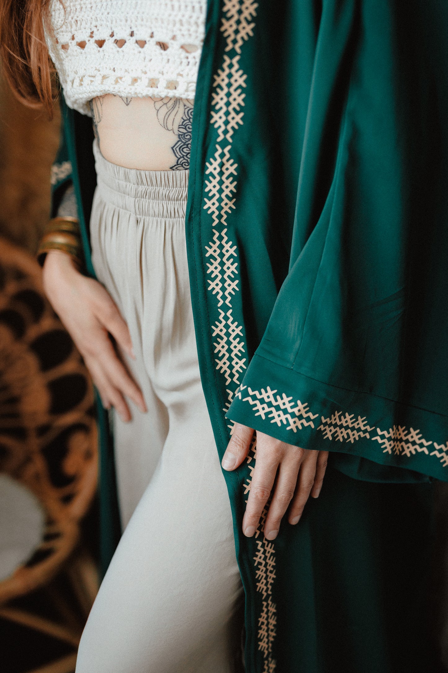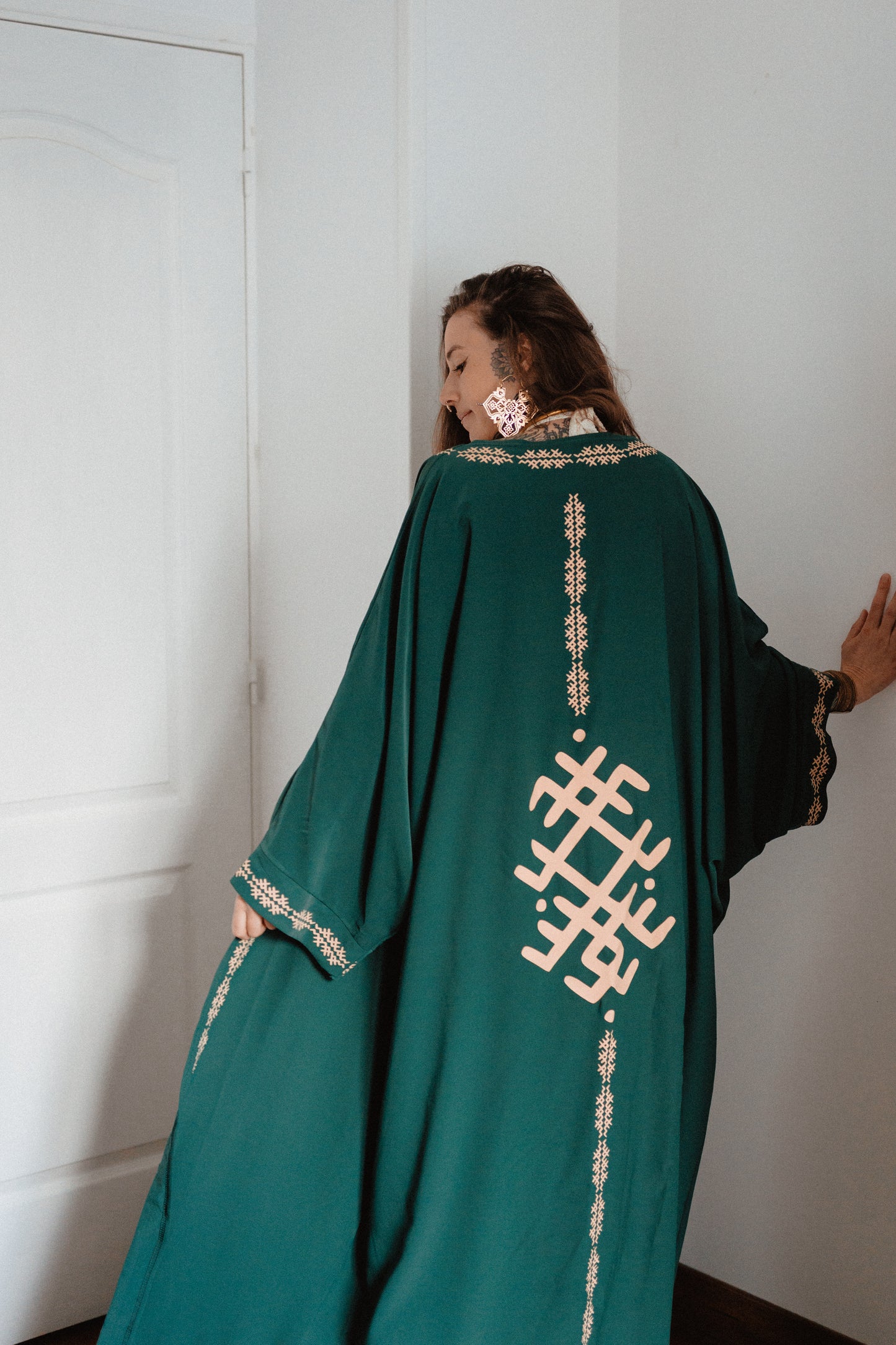 Confectionné dans un tissu doux de couleur vert sapin, il est sublimé par des ornements d'inspiration berbère en beige, apportant une touche sophistiquée et originale à votre garde-robe.