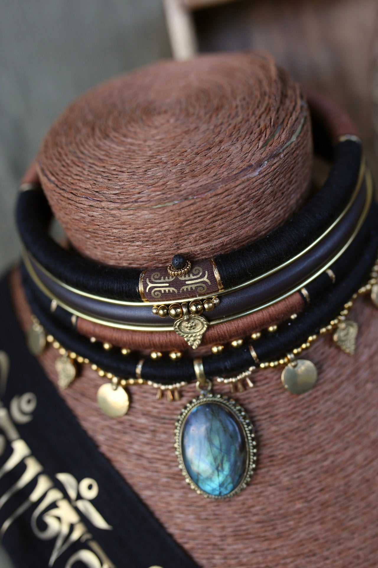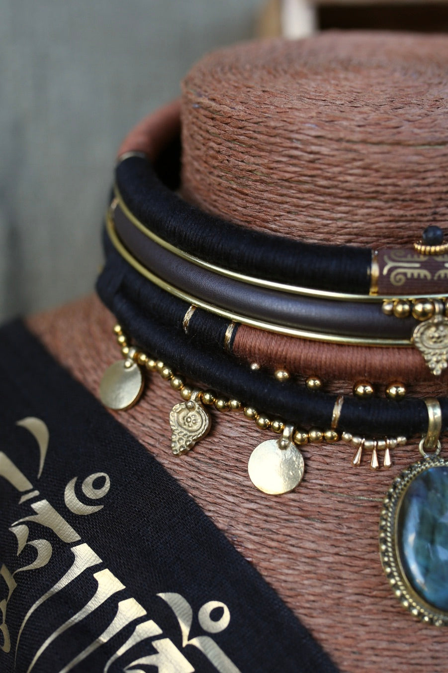 Collier multi-rangs totalement amovible, composé de 4 rangs en fil de coton noir et brun, laiton travaillé et perles en acier inoxydable.