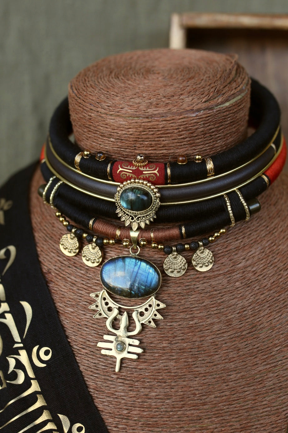 Il est orné de deux labradorites aux reflets intenses : une plus petite en pendentif central supérieur, et une grande pierre principale montée sur un élément symbolique en laiton aux allures rituelles.