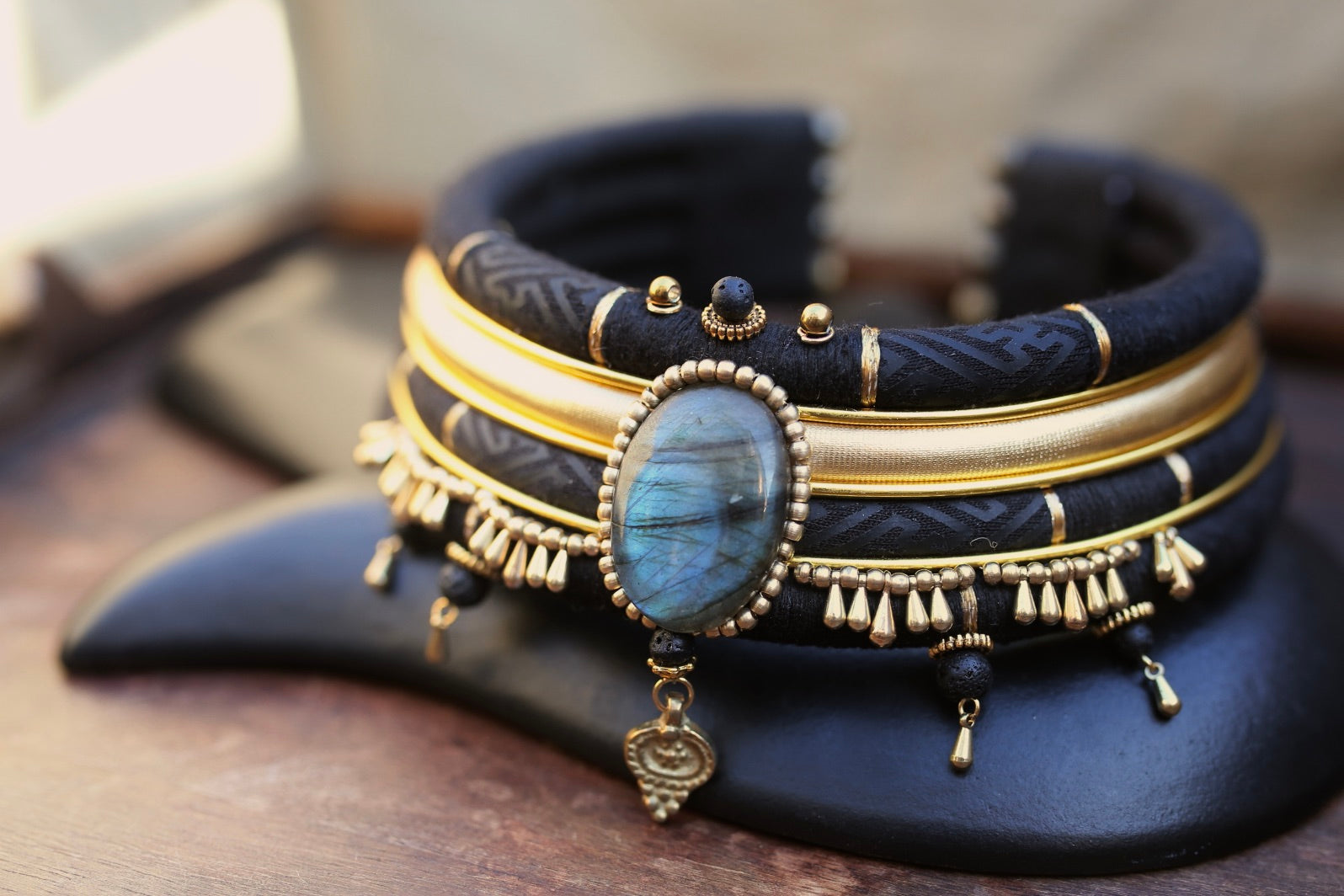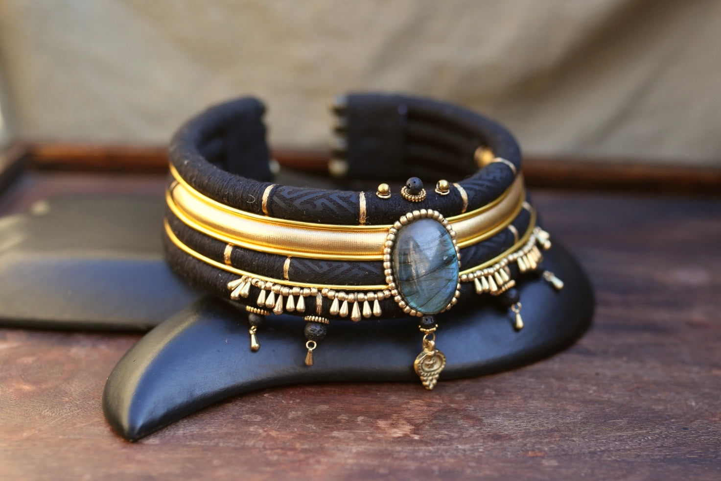 Il est composé de fil de coton noir, de mon tissu sayagata créé et floqué par mes soins, de perles en laiton, ainsi qu’une labradorite centrale aux reflets bleutés, encerclée de détails dorés.