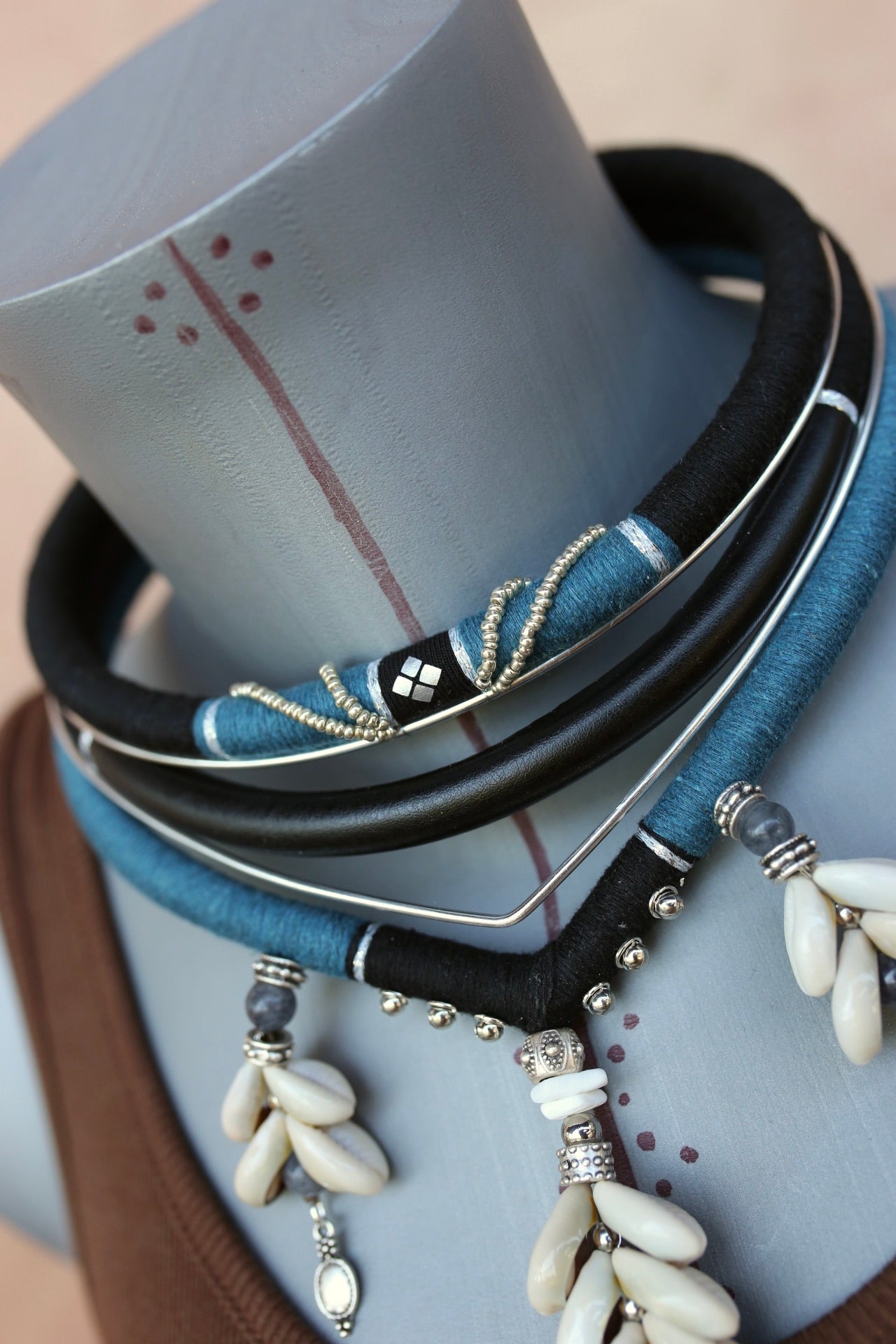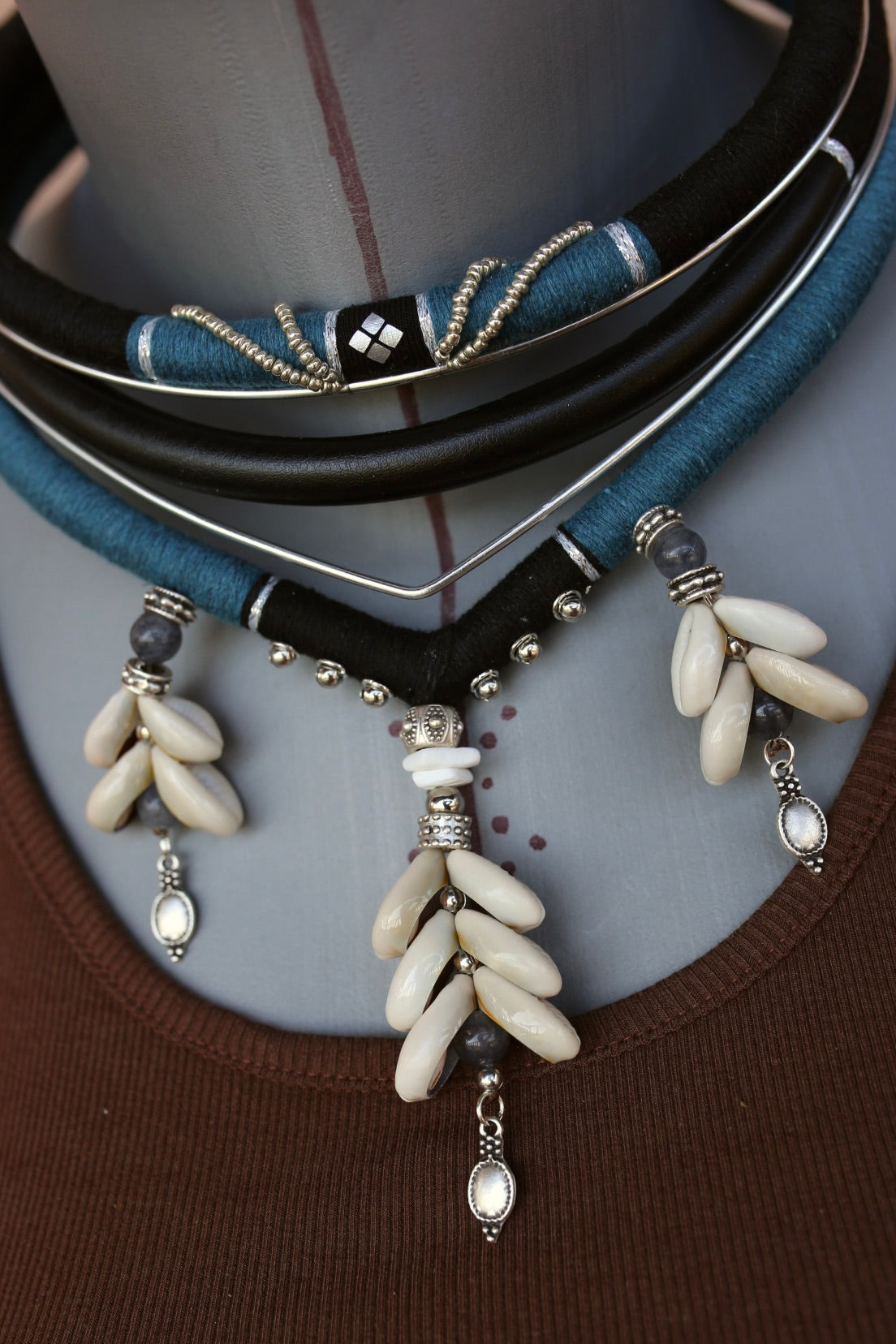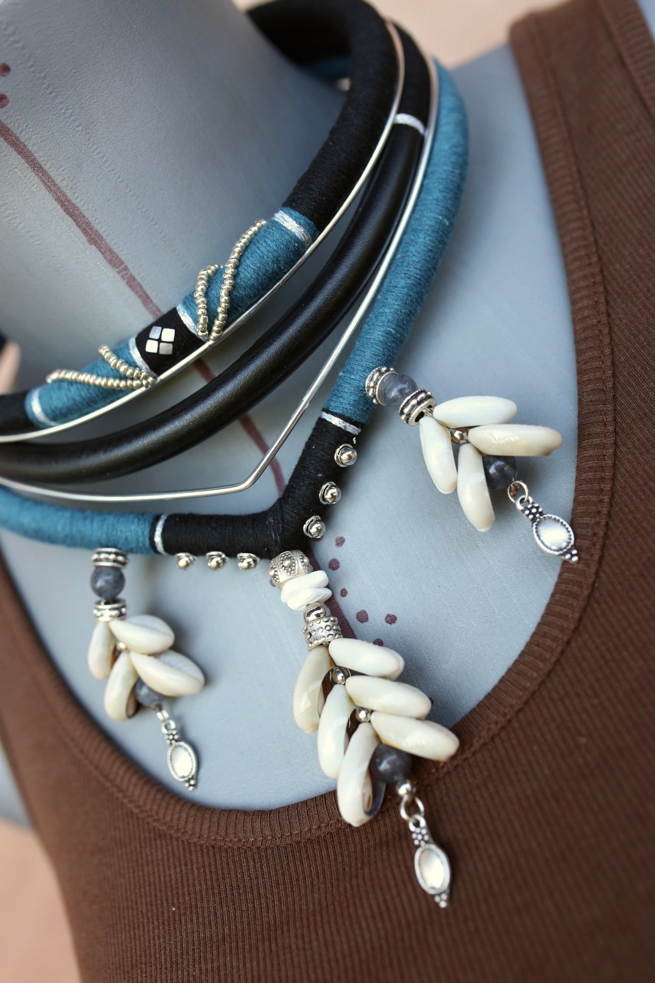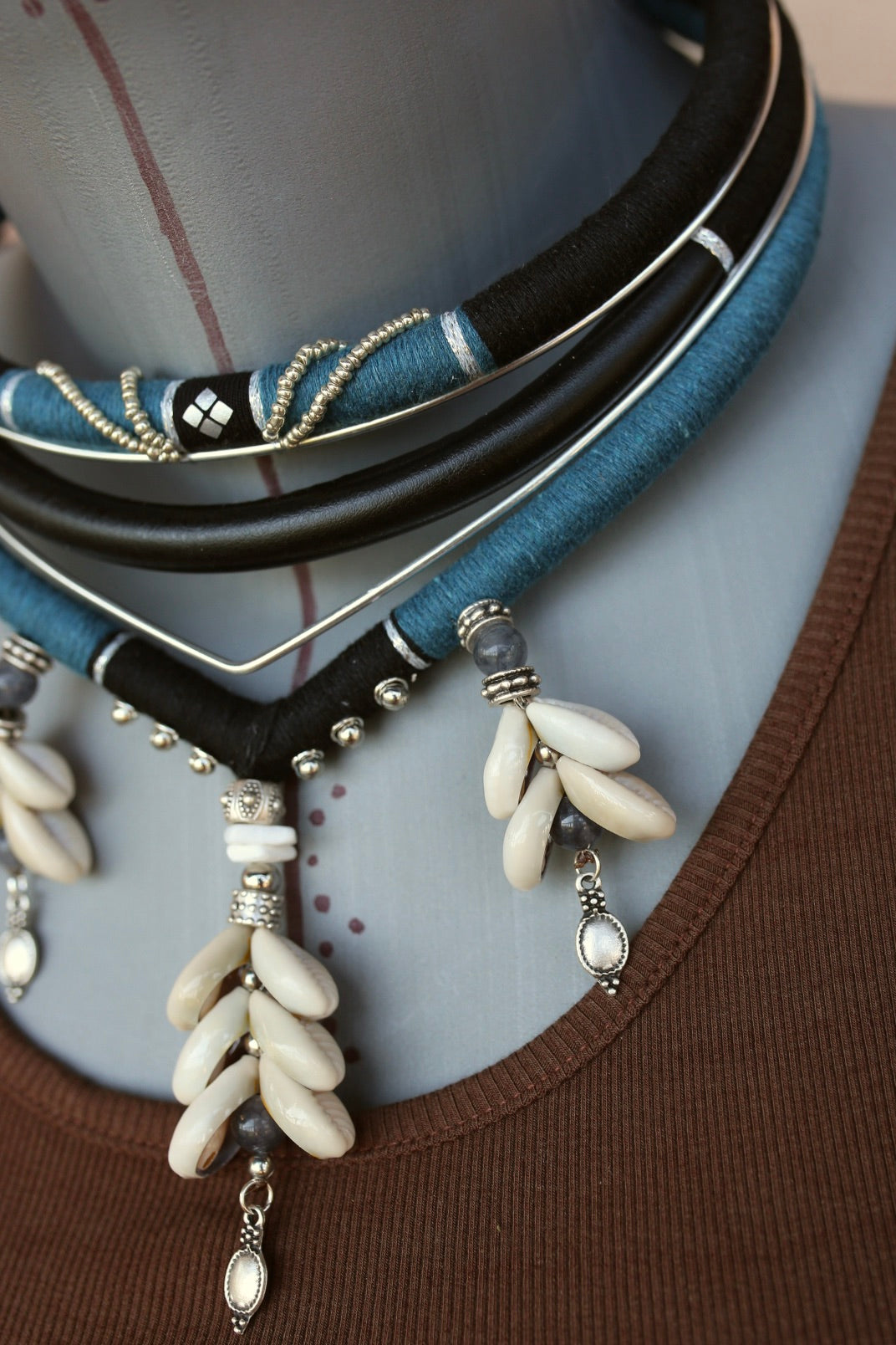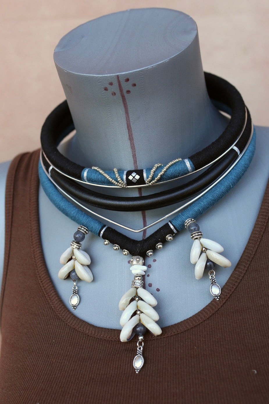 Collier à trois rangs, dont un en forme de pointe, mêlant fil de coton noirs, bleu océan & simili cuir ornés de détails argentés. Agrémenté de coquillages naturels, perles et pendentifs nacrés, il évoque la force des vagues et l’élégance marine.