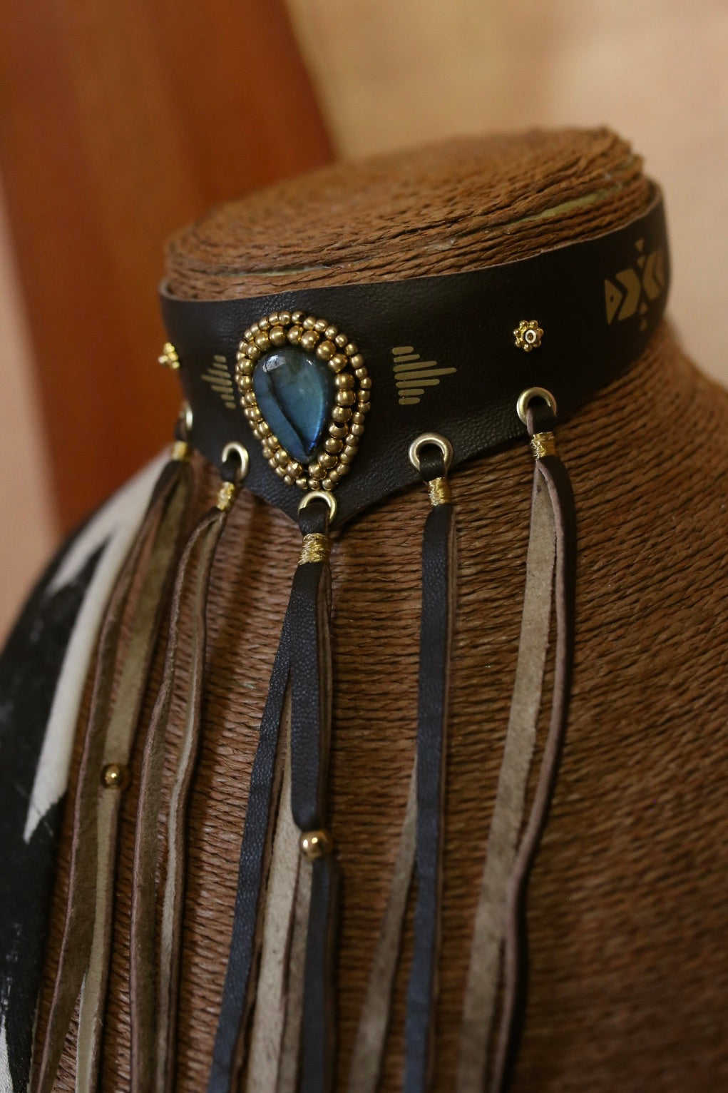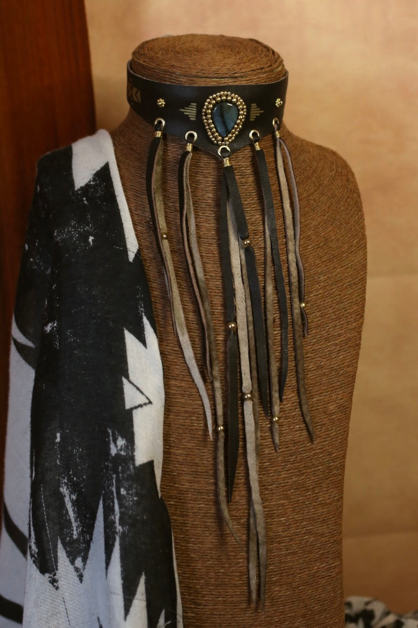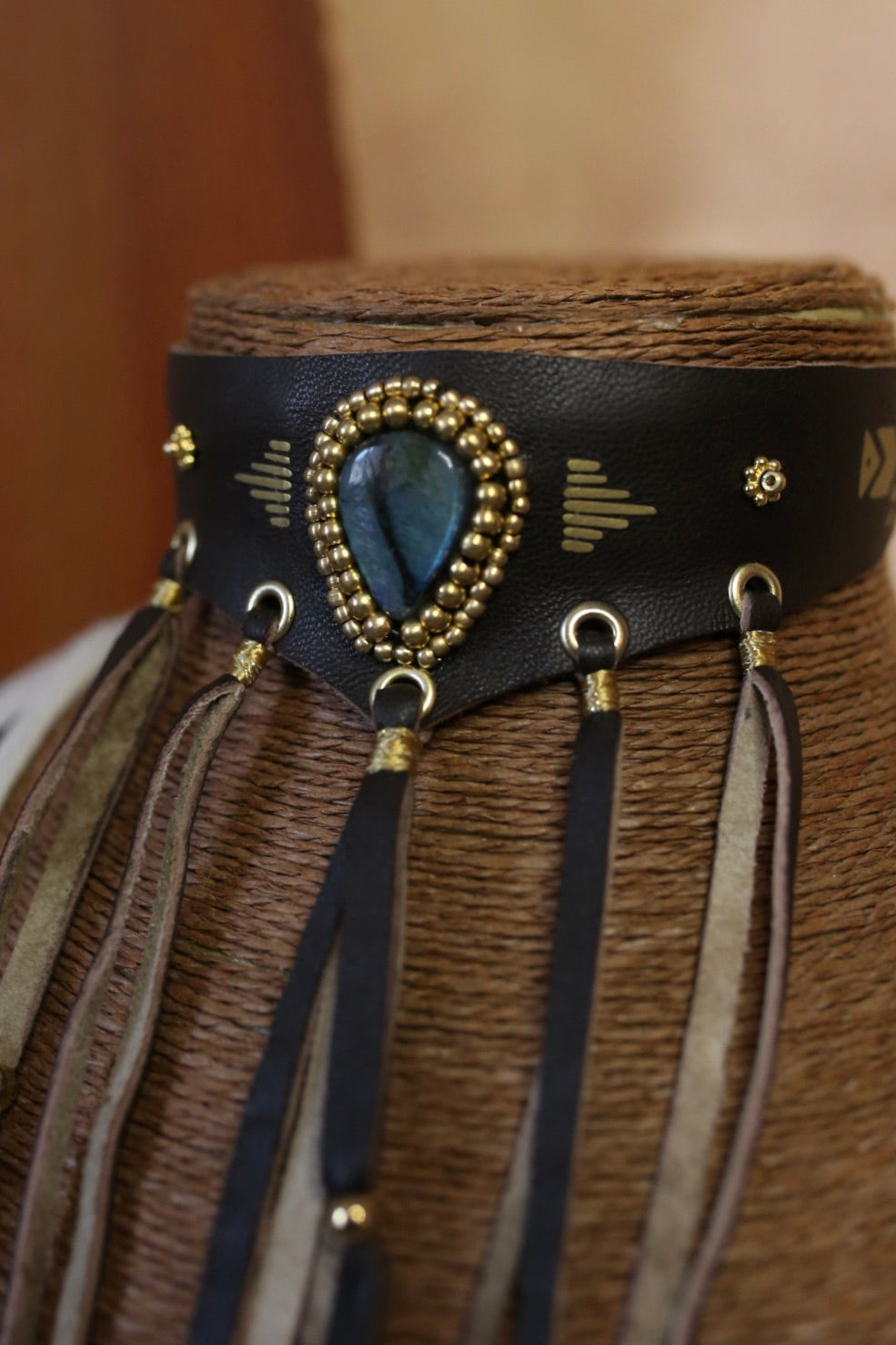 Un ras-de-cou en cuir marron foncé au style western puissant, sublimé par une labradorite centrale aux reflets profonds, entourée de perles dorées. Les motifs dorés et les œillets métalliques apportent un caractère brut, tandis que les franges en cuir faites à la main donnent ce mouvement sauvage et élégant qui fait toute la pièce.