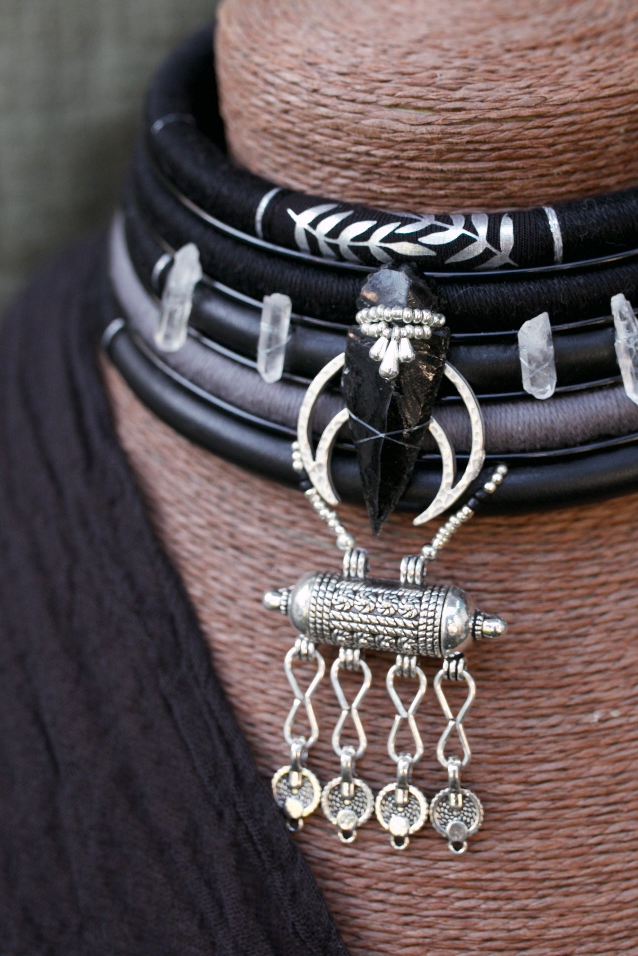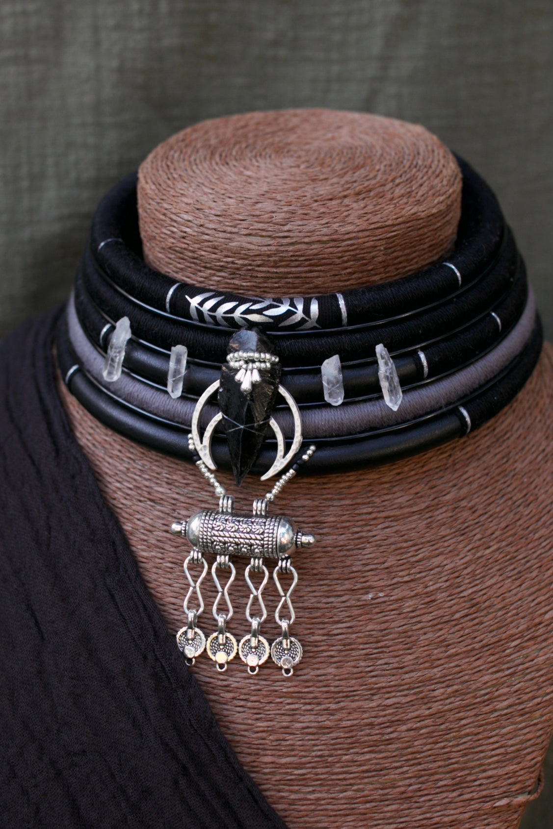 J'ai confectionné ce collier ras de cou avec un fil de coton. De couleur noir et argenté.