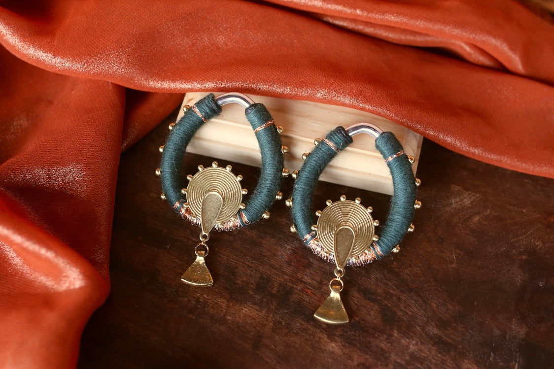 J'ai confectionné ces poids d'oreilles avec un fil de coton vert sapin et cuivré ainsi que des perles en laiton doré.