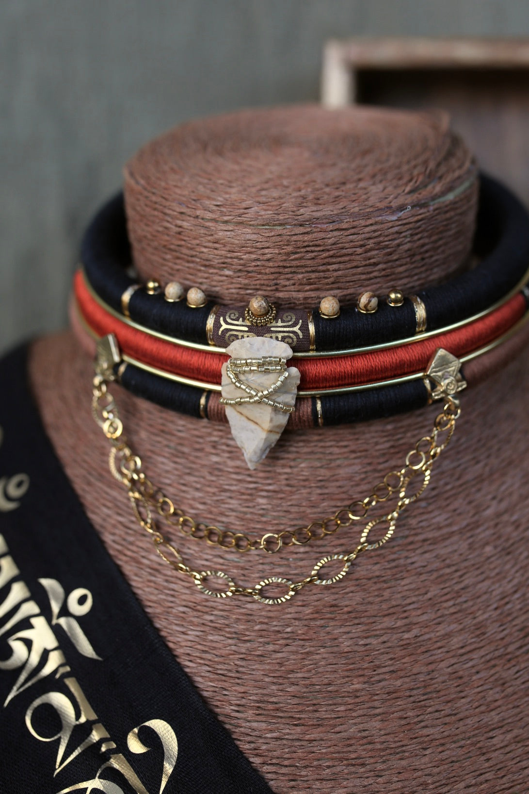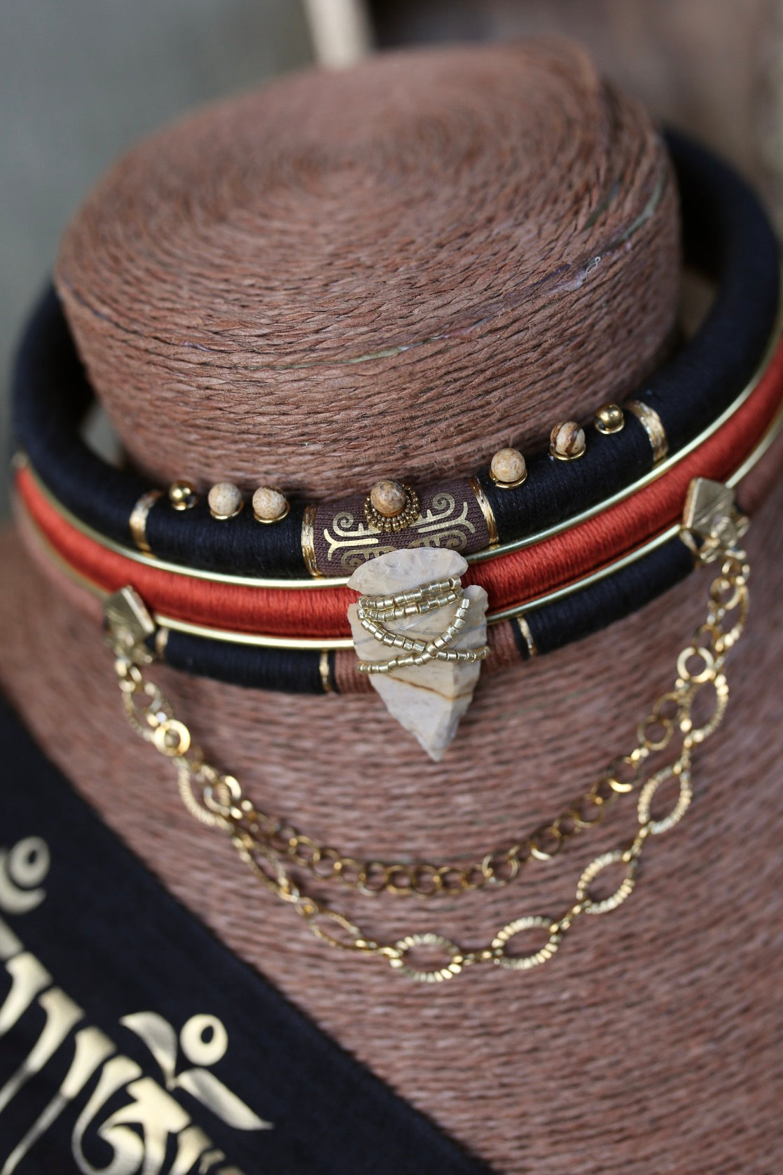 Collier amovible composé de 3 rangs en fil de coton noir, brun et terre cuite, rehaussé de laiton gravé et de perles en acier inoxydable.